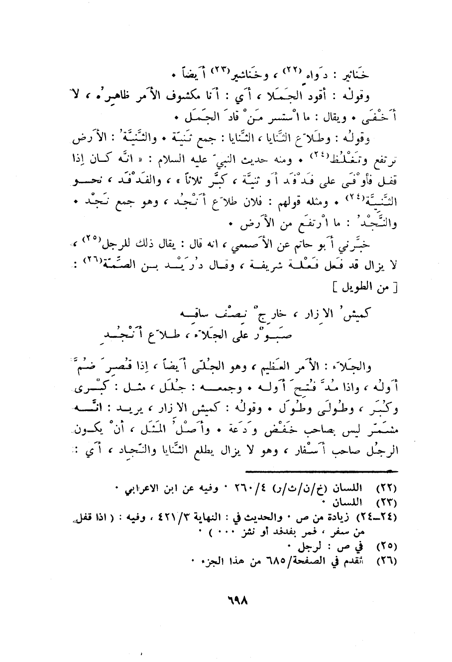 خبرني ابو حَاتِم عَن الْأَصْمَعِي انه قَالَ: يُقَال ذَلِك للرجل لَا يزَال قد فعل فعلة شريفة وَقَالَ دُرَيْد بن الصمَّة: من الطَّوِيل ... كمش الْإِزَار خَارج نصف سَاقه ... صبور على الْجلاء طلاع أنجد ...