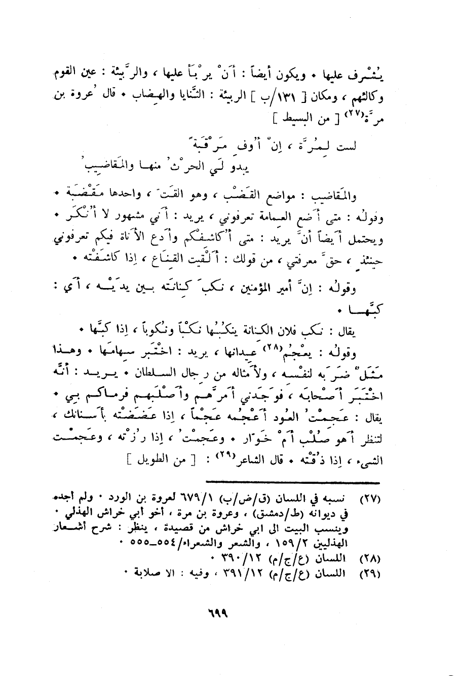 والمقاضيب: مَوَاضِع القضب وَهُوَ القتواحدها مقضبة. وَقَوله: مَتى أَضَع الْعِمَامَة تعرفوني يُرِيد أَنِّي مَشْهُور لَا أنكر. وَيحْتَمل ايضا أَن يُرِيد: مَتى أكاشفكم وأدع الأناءة فِيكُم تعرفوني حِينَئِذٍ حق معرفتي من قَوْلك: ألقيت القناع إِذا كاشفته.