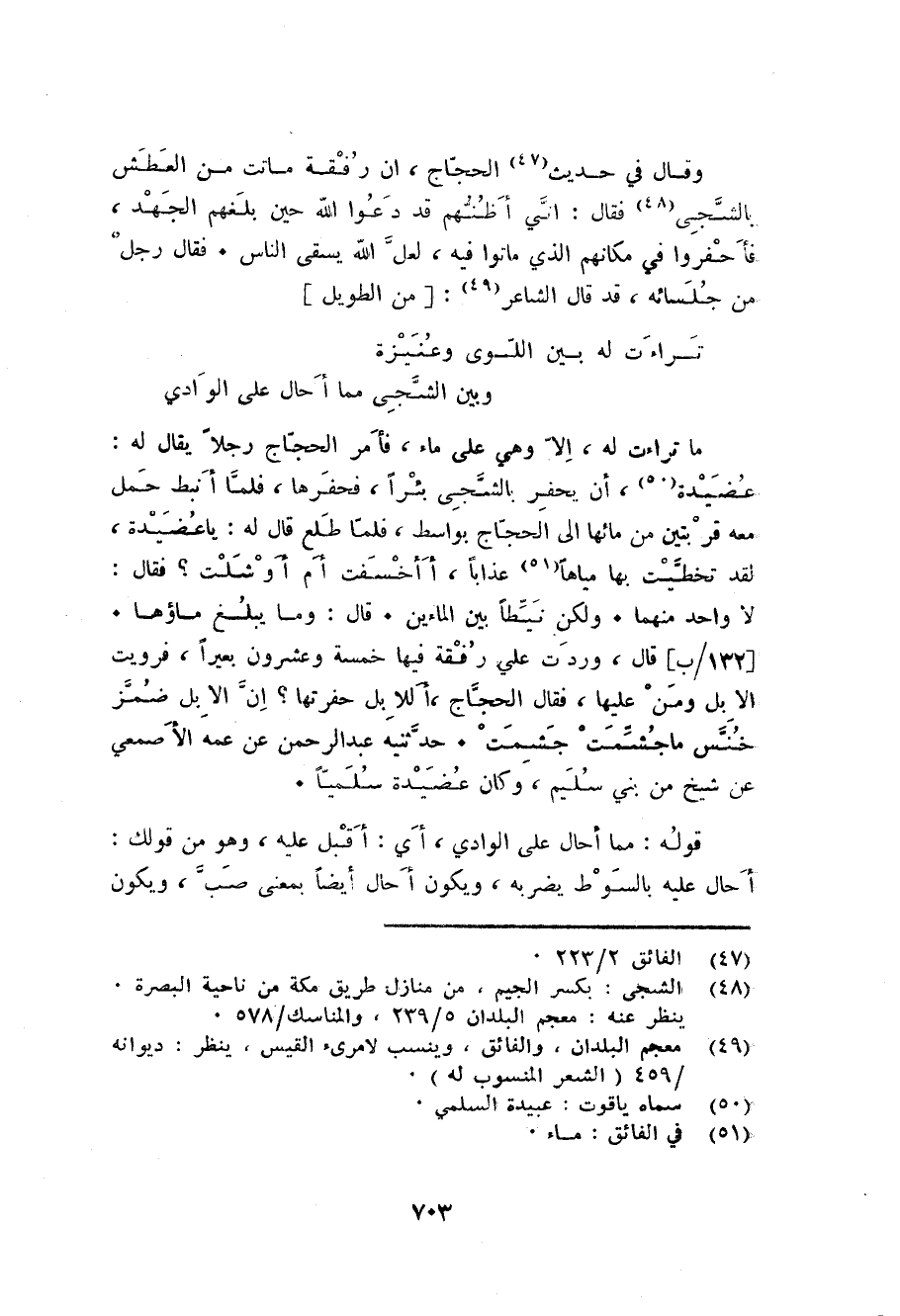 وَقَالَ فِي حَدِيث الْحجَّاج ان رفْقَة مَاتَت من الْعَطش بالشجى فَقَالَ: إِنِّي أظنهم قد دعوا الله حِين بَلغهُمْ الْجهد فأحفروا فِي مكانهم الَّذِي مَاتُوا فِيهِ لَعَلَّ الله يسقى النَّاس. فَقَالَ رجل من جُلَسَائِهِ قد قَالَ الشَّاعِر: من الطَّوِيل ... تراءت لَهُ بَين اللوي وعنيزة ... وَبَين الشجى مِمَّا أحَال على الْوَادي ...
