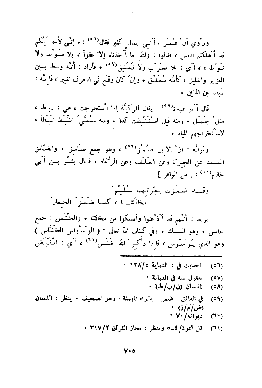 وَرُوِيَ أَن عمر أُتِي بِمَال كثير فَقَالَ: إنى لأحسبكم قد أهلكتم النَّاس فَقَالُوا: وَالله مَا أخذناه إِلَّا عفوا بِلَا سَوط وَلَا نوط اي: بِلَا ضرب وَلَا تَعْلِيق فَأَرَادَ: أَنه وسط بَين الغزير والقليل كَأَنَّهُ مُعَلّق وَإِن كَانَ وَقع فِي الْحَرْف تَغْيِير فَإِنَّهُ: نبط بَين المائين.