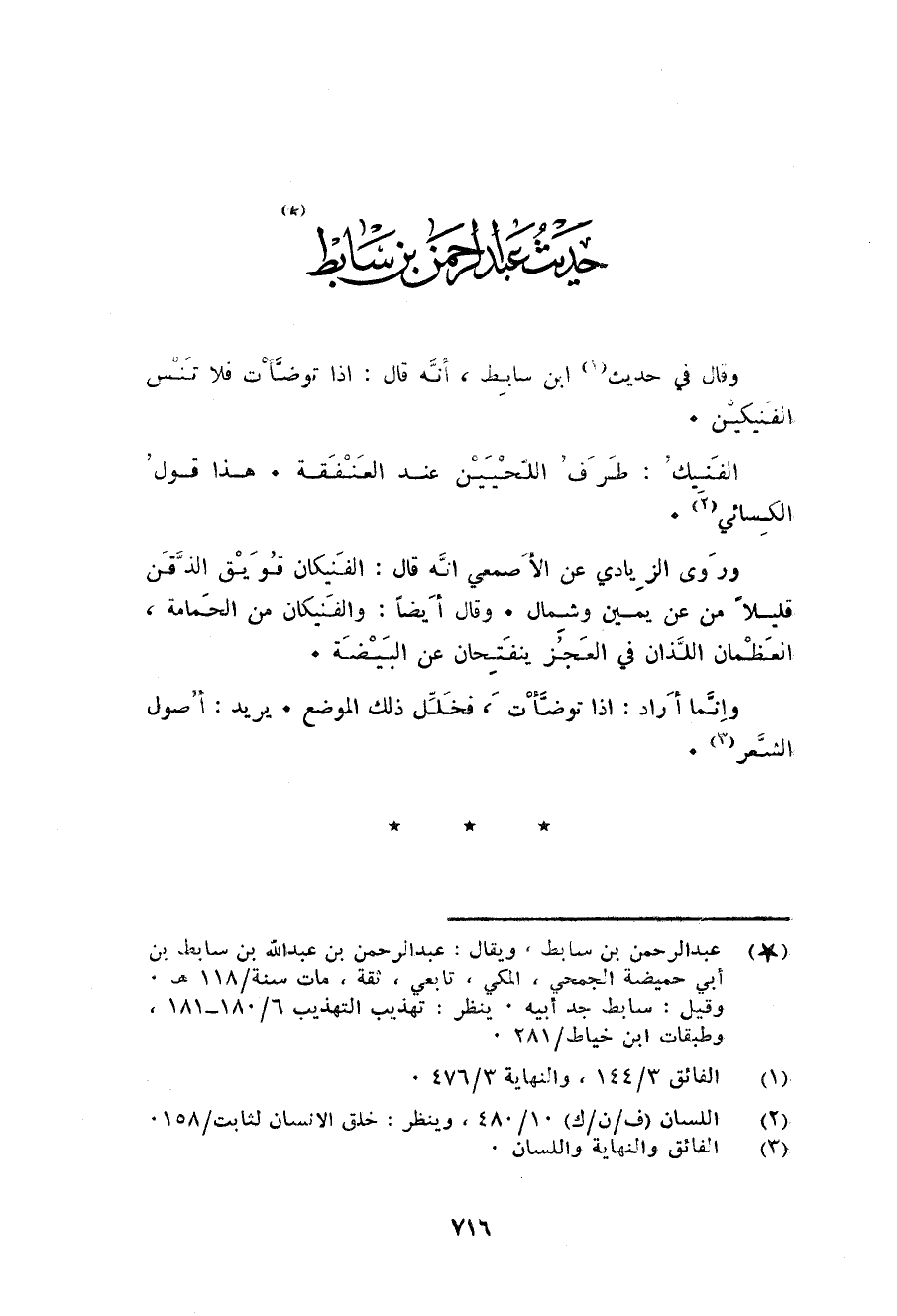 وَقَالَ فِي حَدِيث ابْن سابط أَنه قَالَ: إِذا تَوَضَّأت فَلَا تنس الفنيكين. الفنيك: طرف اللحيين عِنْد العنفقة. هَذَا قَول الْكسَائي.