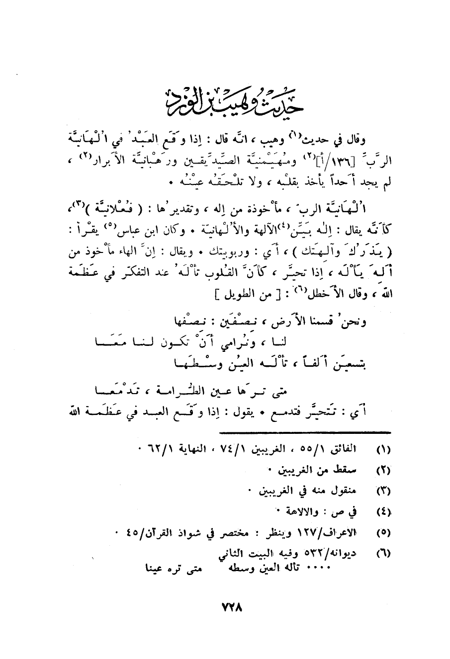 وَقَالَ فِي حَدِيث وهيب انه قَالَ: إِذا وَقع العَبْد فِي الهانية الرب ومهيمنية الصيديقين ورهبانية الْأَبْرَار لم يجد أحدا يَأْخُذ بِقَلْبِه وَلَا تلْحقهُ عينه.