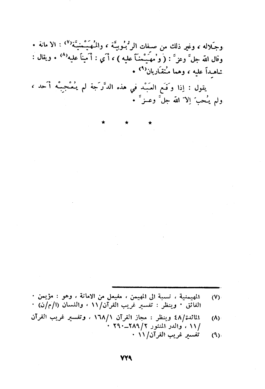 وجلاله وَغير ذَلِك من صِفَات الربوبية والمهيمنية: الامانة. وَقَالَ الله جلّ وَعز: {ومهيمنا عَلَيْهِ} أَي: أَمينا عَلَيْهِ. وَيُقَال: شَاهدا عَلَيْهِ وهما متقاربان.