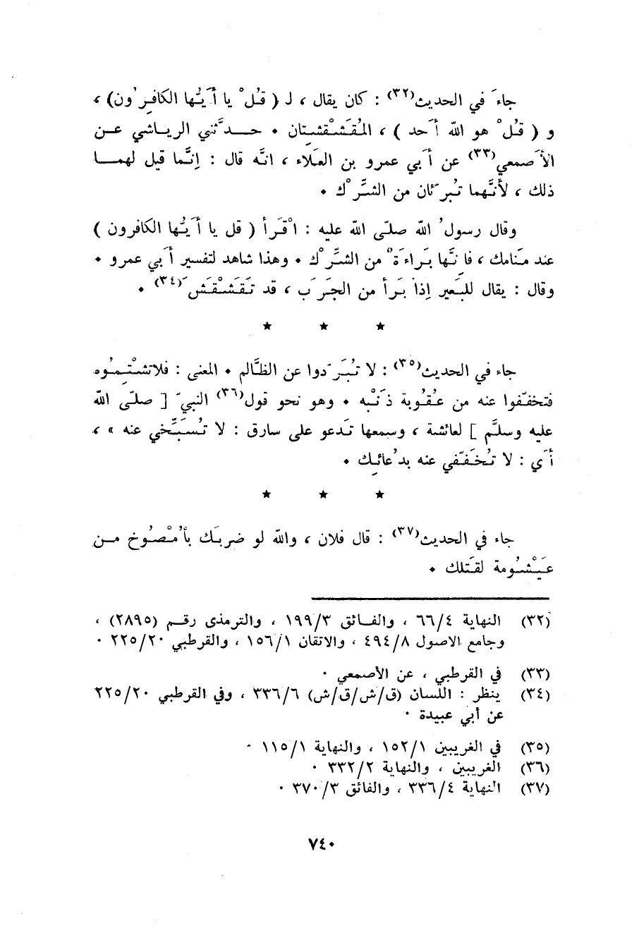 جَاءَ فِي الحَدِيث: كَانَ يُقَال ل {قل يَا أَيهَا الْكَافِرُونَ} و {قل هُوَ الله أحد} المقشقشتان. حَدثنِي الرياشي عَن الأصمعى عَن أَبى عَمْرو بن الْعَلَاء انه قَالَ: إِنَّمَا قيل لَهما ذَلِك لِأَنَّهُمَا تبرئان من الشّرك.