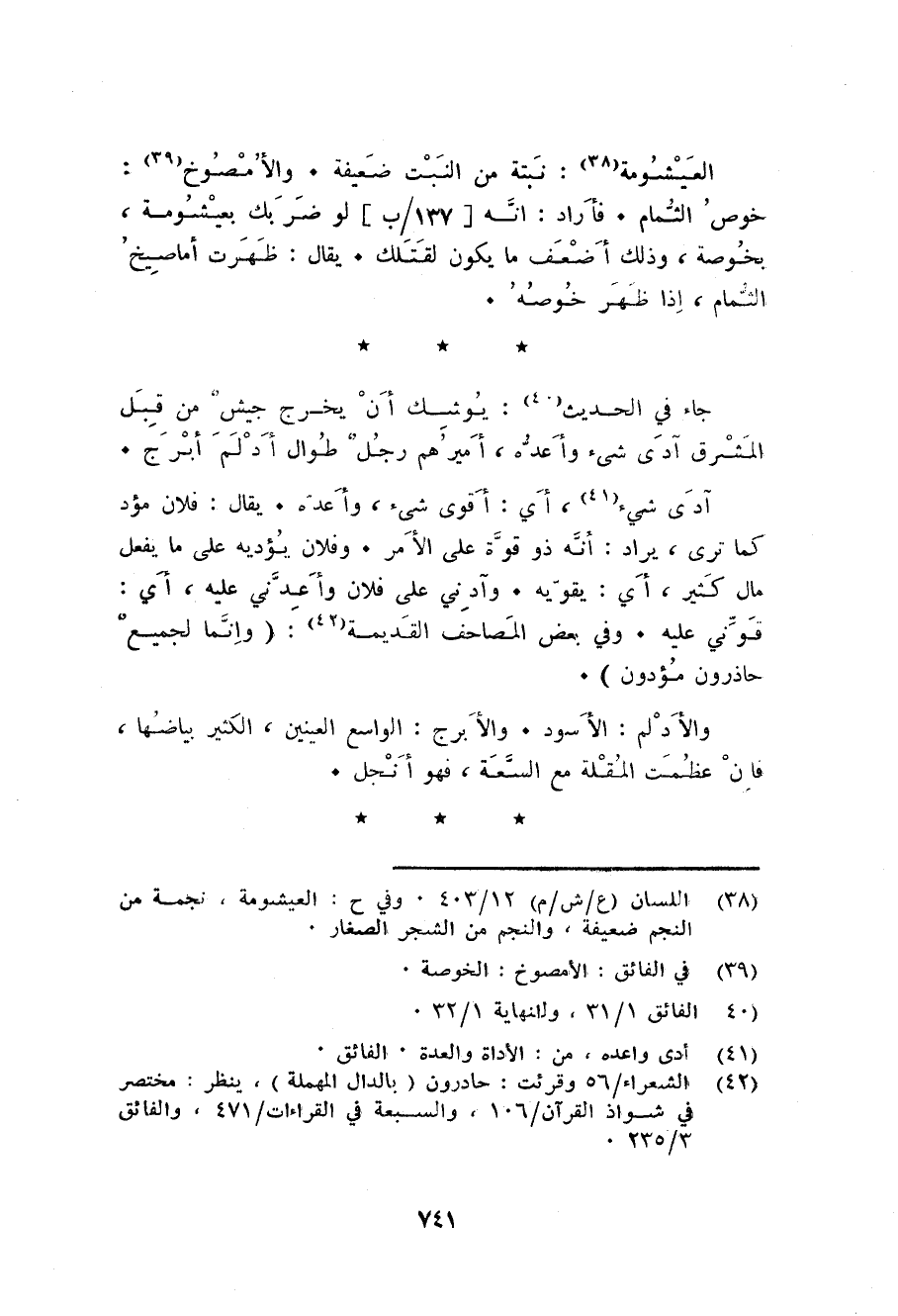 آدى شَيْء اي: أقوى شىء واعده. يُقَال. فلَان مؤد كَمَا ترى يُرَاد: أَنه ذُو قُوَّة على الْأَمر. وَفُلَان يُؤَدِّيه على مَا يفعل مَال كثير أَي: يقويه. وآدني على فلَان وأعدني عَلَيْهِ أَي قونى عَلَيْهِ. وَفِي بعض الْمَصَاحِف الْقَدِيمَة: / وَإِنَّمَا لجَمِيع حاذرون مؤدون /.