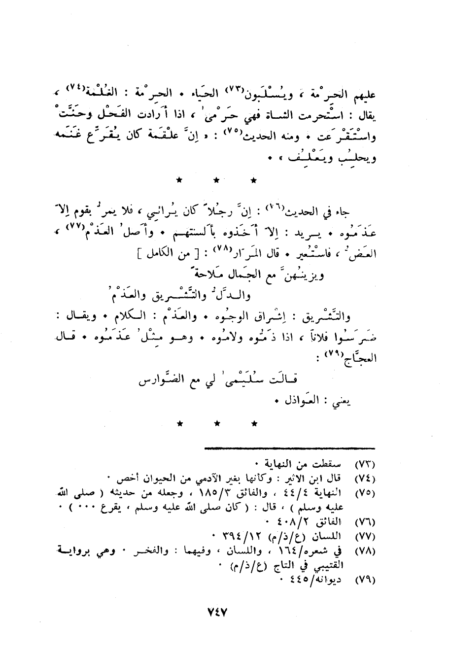 والتشريق: إشراق الْوُجُوه. والعذم: الْكَلَام. وَيُقَال ضرسوا فلَانا إِذا ذموه ولاموه. وَهُوَ مثل عذموه. قَالَ العجاج: ... قَالَت سليمى لى مَعَ الضوارس ... يعنيى: العواذل.