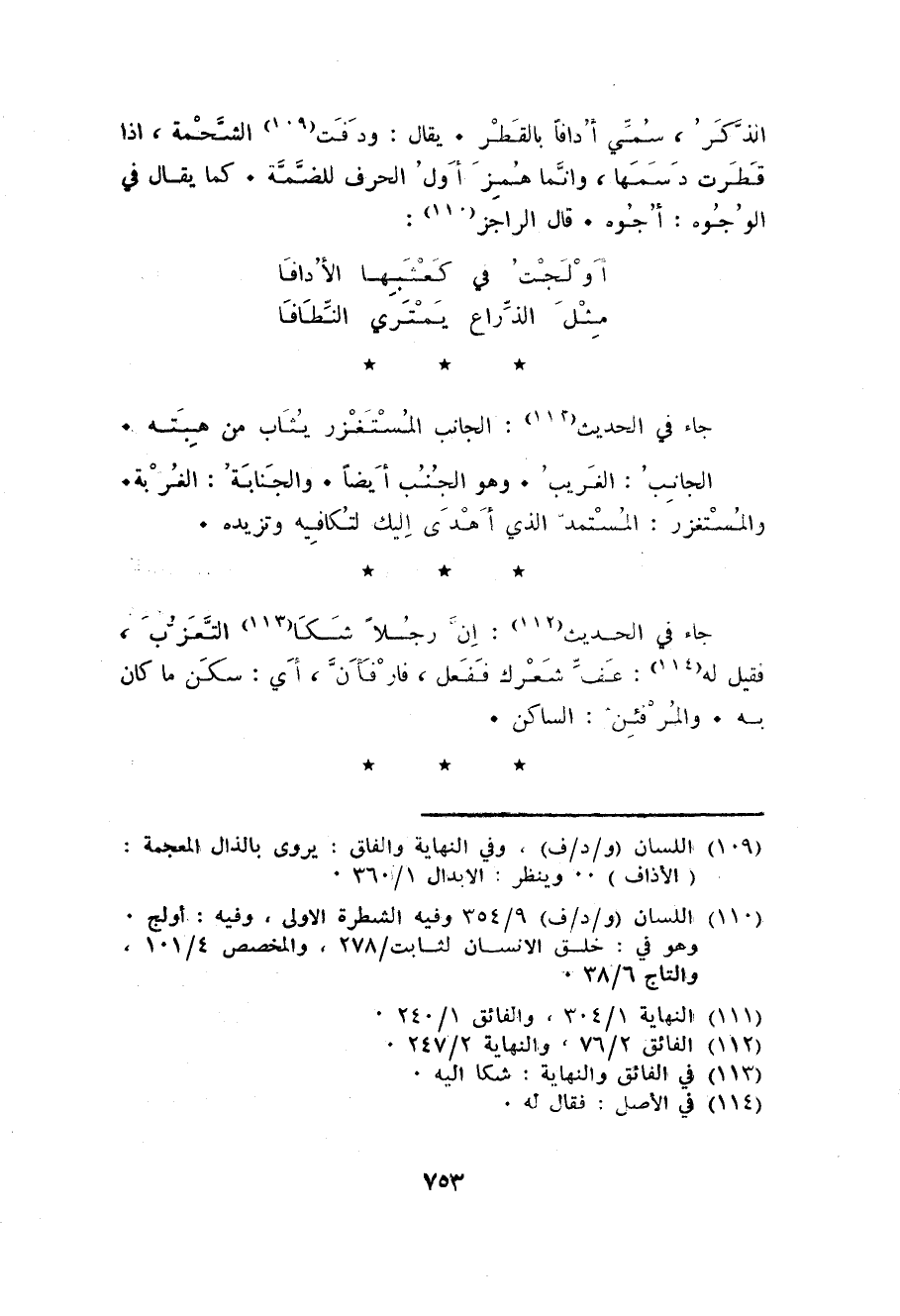 الذّكر سمي أدافا بالقطر. يُقَال: ودفت الشحمة إِذا قطرت دسمها وَإِنَّمَا همز أول الْحَرْف للضمة. كَمَا يُقَال فِي الْوُجُوه: أجوه. قَالَ الراجز: ... أولجت فِي كعثبها الأدافا ... مثل الذِّرَاع يمتري النطافا ...