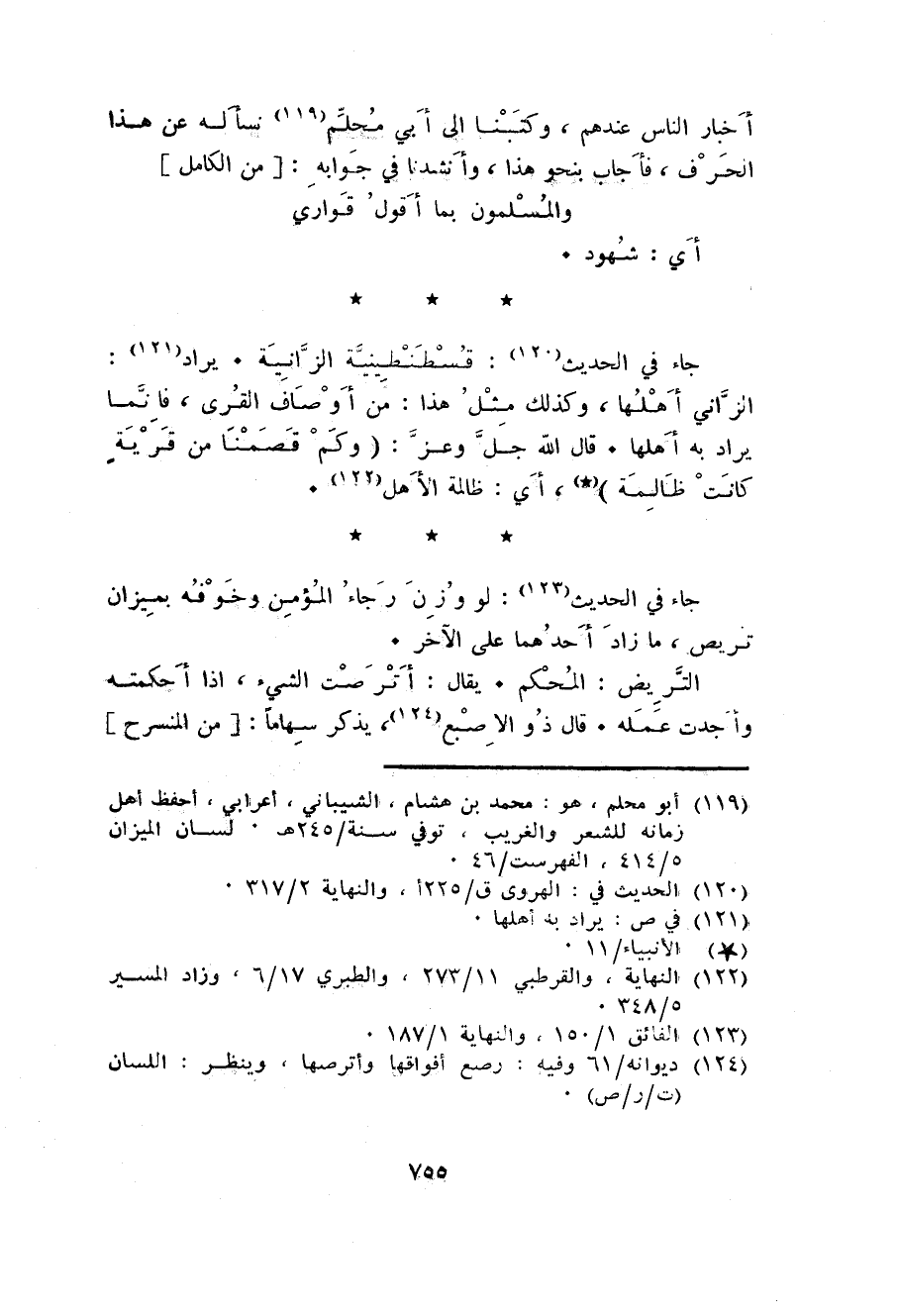 جَاءَ فِي الحَدِيث: قسطنطينية الزَّانِيَة. يُرَاد: الزَّانِي أَهلهَا وَكَذَلِكَ مثل هَذَا: من أَوْصَاف الْقرى فَإِنَّمَا يُرَاد بِهِ أَهلهَا. قَالَ الله جلّ وَعز: {وَكم قصمنا من قَرْيَة كَانَت ظالمة} أَي: ظالمة الْأَهْل.