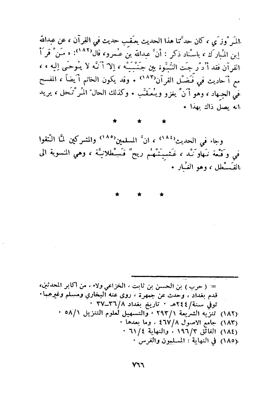 الْمروزِي كَانَ حَدثنَا هَذَا الحَدِيث بعقب حَدِيث فِي الْقُرْآن عَن عبد الله إِبْنِ الْمُبَارك باسناد ذكر: أَن عبد الله بن عَمْرو قَالَ: من قَرَأَ الْقُرْآن فقد أدرجت النُّبُوَّة بَين جَنْبَيْهِ إِلَّا أَنه لَا يُوحى إِلَيْهِ من أَحَادِيث فِي فضل الْقُرْآن وَقد يكون الْخَاتم أَيْضا المفسح فِي الْجِهَاد وَهُوَ أَن يَغْزُو ويعقب. وَكَذَلِكَ الْحَال المرتحل يُرِيد أَنه يصل ذَات بِهَذَا.