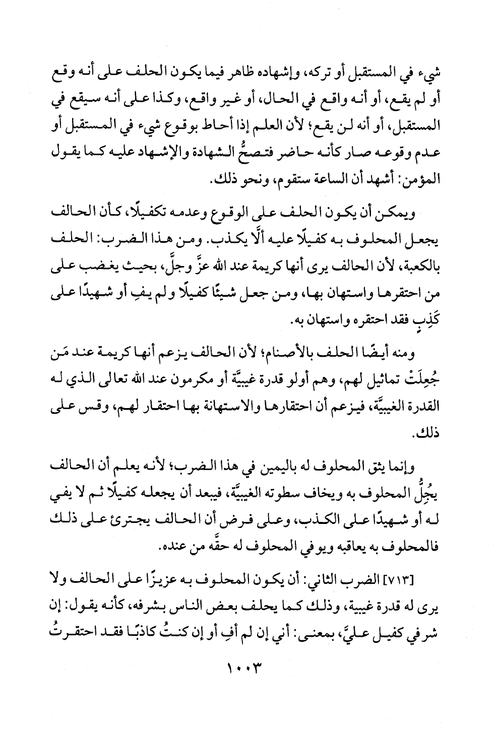 [٧١٣] الضرب الثاني: أن يكون المحلوف به عزيزًا على الحالف ولا يرى له قدرة غيبية، وذلك كما يحلف بعض الناس بشرفه، كأنه يقول: إن شرفي كفيل عليَّ، بمعنى: أني إن لم أفِ أو إن كنتُ كاذبًا فقد احتقرتُ