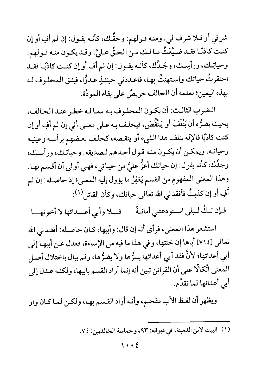 شرفي أو فلا شرف لي. ومنه قولهم: وحقِّك، كأنه يقول: إن لم أفِ أو إن كنت كاذبًا فقد ضيَّعْتُ ما لك من الحقِّ عليَّ. وقد يكون منه قولهم: وحياتِك، ورأسِك، وجَدِّك، كأنه يقول: إن لم أف أو إن كنت كاذبًا فقد احتقرتُ حياتك واستهنتُ بها، فاعددني حينئذٍ عدوًّا, فيثق المحلوف له بهذه اليمين؛ لعلمه أن الحالف حريصٌ على بقاء المودَّة.