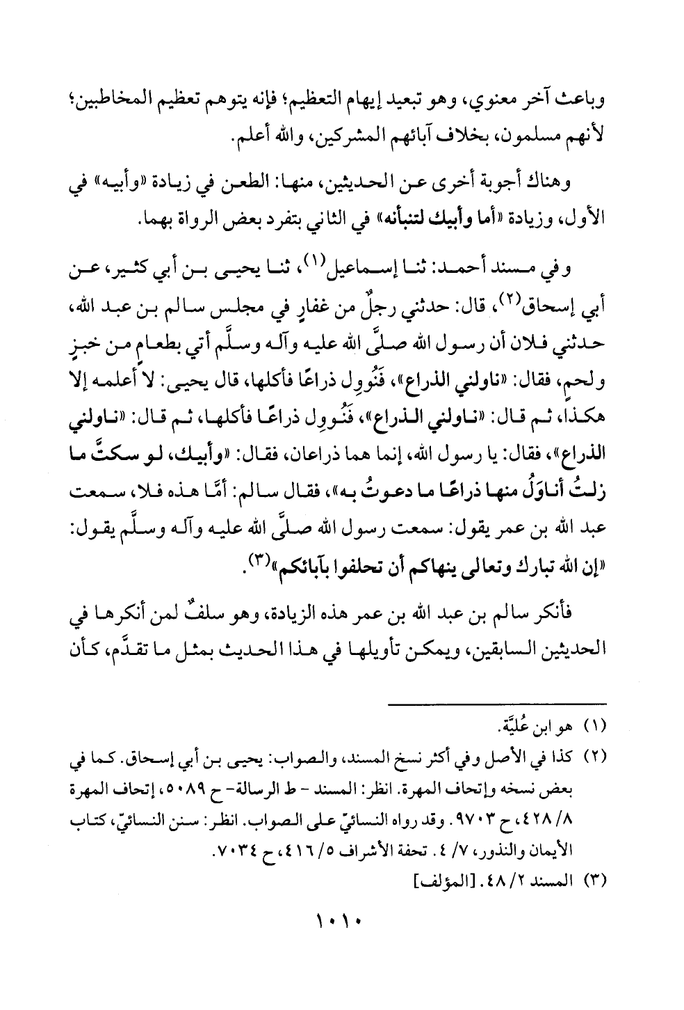 وفي مسند أحمد: ثنا إسماعيل (¬١)، ثنا يحيى بن أبي كثير، عن أبي إسحاق (¬٢)، قال: حدثني رجلٌ من غفارٍ في مجلس سالم بن عبد الله، حدثني فلان أن رسول الله صلَّى الله عليه وآله وسلَّم أتي بطعامٍ من خبزٍ ولحمٍ، فقال: «ناولني الذراع»، فَنُووِل ذراعًا فأكلها، قال يحيى: لا أعلمه إلا هكذا، ثم قال: «ناولني الذراع»، فَنُووِل ذراعًا فأكلها، ثم قال: «ناولني الذراع»، فقال: يا رسول الله، إنما هما ذراعان، فقال: «وأبيك، لو سكتَّ ما زلتُ أناوَلُ منها ذراعًا ما دعوتُ به»، فقال سالم: أمَّا هذه فلا، سمعت عبد الله بن عمر يقول: سمعت رسول الله صلَّى الله عليه وآله وسلَّم يقول: «إن الله تبارك وتعالى ينهاكم أن تحلفوا بآبائكم» (¬٣).