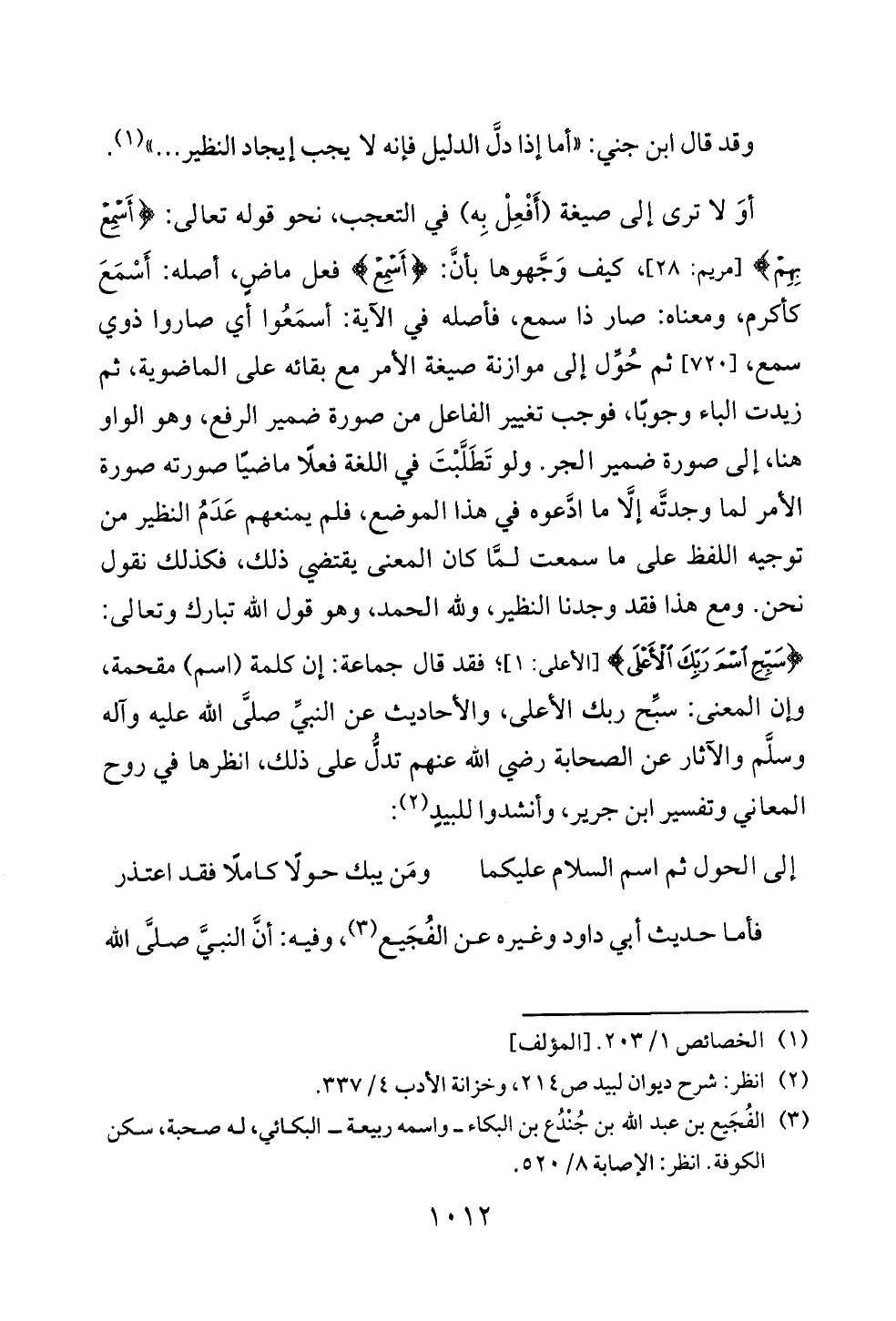 أوَ لا ترى إلى صيغة (أَفْعِلْ بِه) في التعجب، نحو قوله تعالى: {أَسْمِعْ بِهِمْ} [مريم: ٢٨]، كيف وَجَّهوها بأنَّ: {أَسْمِعْ} فعل ماضٍ، أصله: أَسْمَعَ كأكرم، ومعناه: صار ذا سمع، فأصله في الآية: أسمَعُوا أي صاروا ذوي سمع، [٧٢٠] ثم حُوِّل إلى موازنة صيغة الأمر مع بقائه على الماضوية، ثم زيدت الباء وجوبًا، فوجب تغيير الفاعل من صورة ضمير الرفع، وهو الواو هنا، إلى صورة ضمير الجر. ولو تَطَلَّبْتَ في اللغة فعلًا ماضيًا صورته صورة الأمر لما وجدتَّه إلَّا ما ادَّعوه في هذا الموضع، فلم يمنعهم عَدَمُ النظير من توجيه اللفظ على ما سمعت لمَّا كان المعنى يقتضي ذلك، فكذلك نقول نحن. ومع هذا فقد وجدنا النظير، ولله الحمد، وهو قول الله تبارك وتعالى: {سَبِّحِ اسْمَ رَبِّكَ الْأَعْلَى} [الأعلى: ١]؛ فقد قال جماعة: إن كلمة (اسم) مقحمة، وإن المعنى: سبِّح ربك الأعلى، والأحاديث عن النبيِّ صلَّى الله عليه وآله وسلَّم والآثار عن الصحابة رضي الله عنهم تدلُّ على ذلك، انظرها في روح المعاني وتفسير ابن جرير، وأنشدوا للبيدٍ (¬٢):