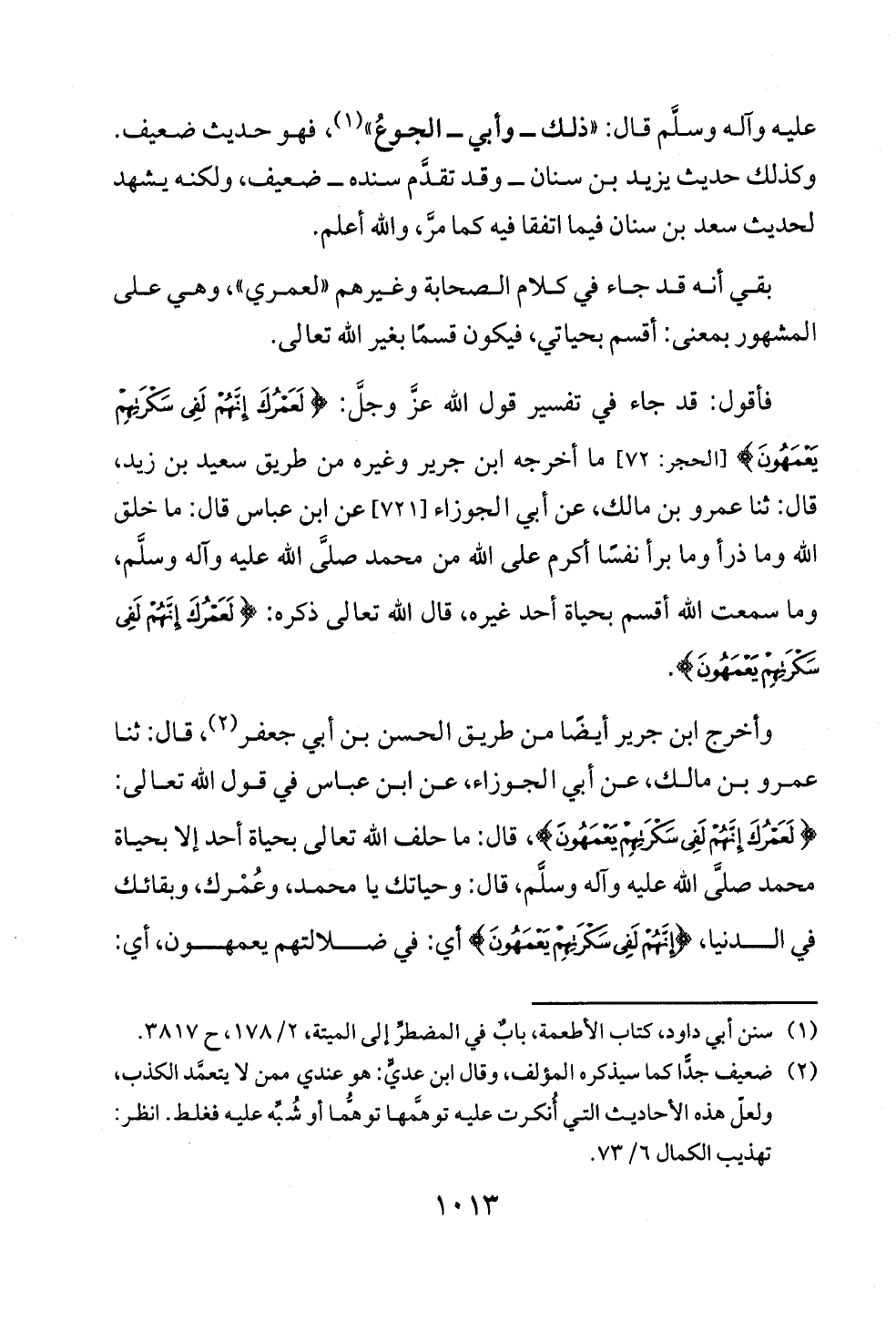 فأقول: قد جاء في تفسير قول الله عزَّ وجلَّ: {لَعَمْرُكَ إِنَّهُمْ لَفِي سَكْرَتِهِمْ يَعْمَهُونَ} [الحجر: ٧٢] ما أخرجه ابن جرير وغيره من طريق سعيد بن زيد، قال: ثنا عمرو بن مالك، عن أبي الجوزاء [٧٢١] عن ابن عباس قال: ما خلق الله وما ذرأ وما برأ نفسًا أكرم على الله من محمد صلَّى الله عليه وآله وسلَّم، وما سمعت الله أقسم بحياة أحد غيره، قال الله تعالى ذكره: {لَعَمْرُكَ إِنَّهُمْ لَفِي سَكْرَتِهِمْ يَعْمَهُونَ}.