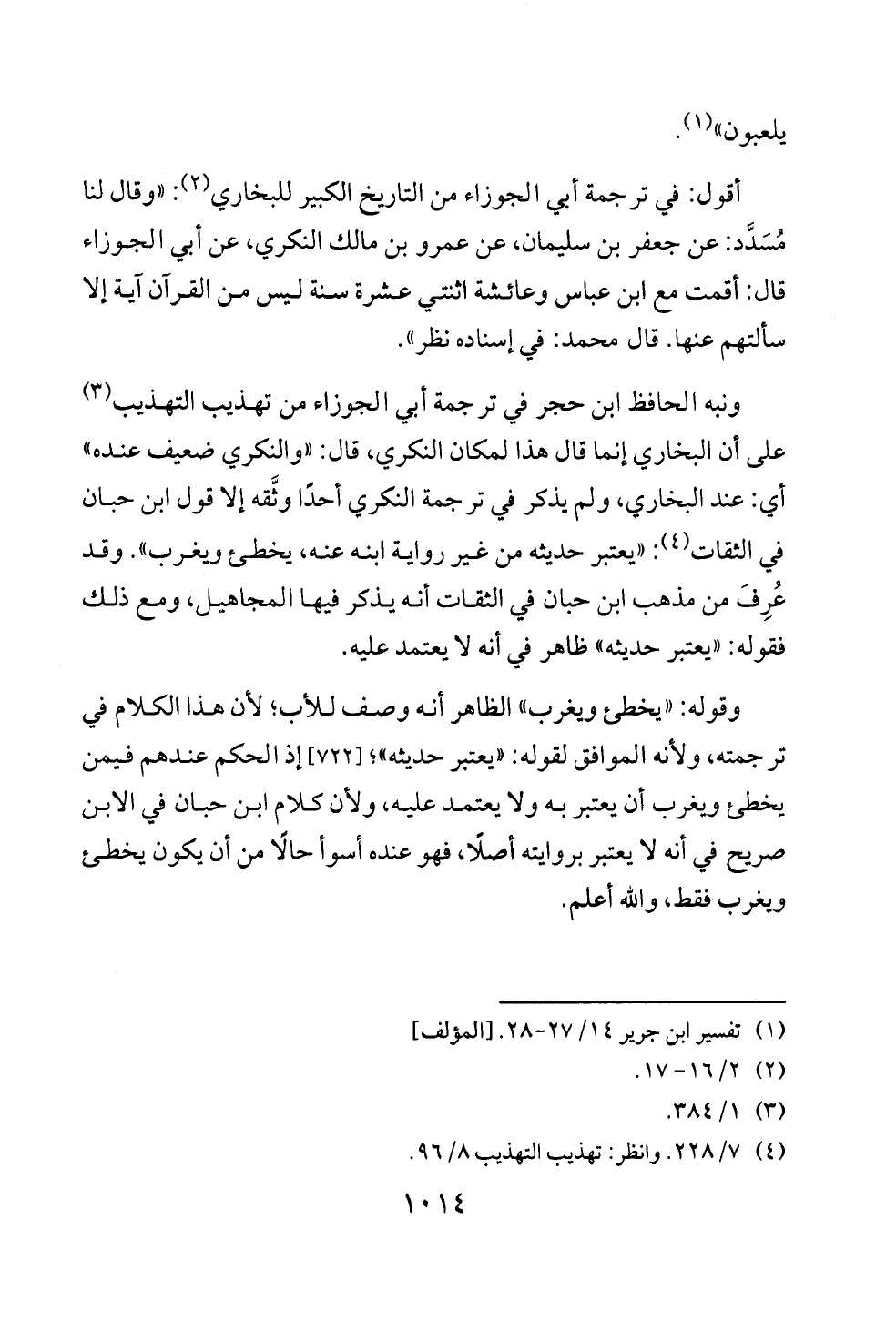 ونبه الحافظ ابن حجر في ترجمة أبي الجوزاء من تهذيب التهذيب (¬٣) على أن البخاري إنما قال هذا لمكان النكري، قال: «والنكري ضعيف عنده» أي: عند البخاري، ولم يذكر في ترجمة النكري أحدًا وثَّقه إلا قول ابن حبان في الثقات (¬٤): «يعتبر حديثه من غير رواية ابنه عنه، يخطئ ويغرب». وقد عُرِفَ من مذهب ابن حبان في الثقات أنه يذكر فيها المجاهيل، ومع ذلك فقوله: «يعتبر حديثه» ظاهر في أنه لا يعتمد عليه.