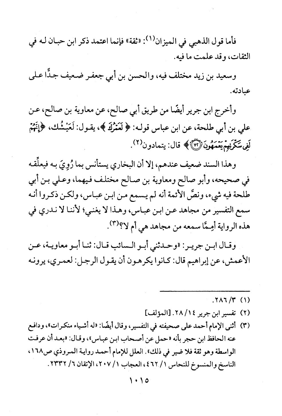 وهذا السند ضعيف عندهم، إلا أن البخاري يستأنس بما رُوِيَ به فيعلِّقه في صحيحه، وأبو صالح ومعاوية بن صالح مختلف فيهما، وعلي بن أبي طلحة فيه شيء، ونصَّ الأئمة أنه لم يسمع من ابن عباس، ولكن ذكروا أنه سمع التفسير من مجاهد عن ابن عباس، وهذا لا يغني؛ لأننا لا ندري في هذه الرواية أمِمَّا سمعه من مجاهد هي أم لا؟ (¬٣).