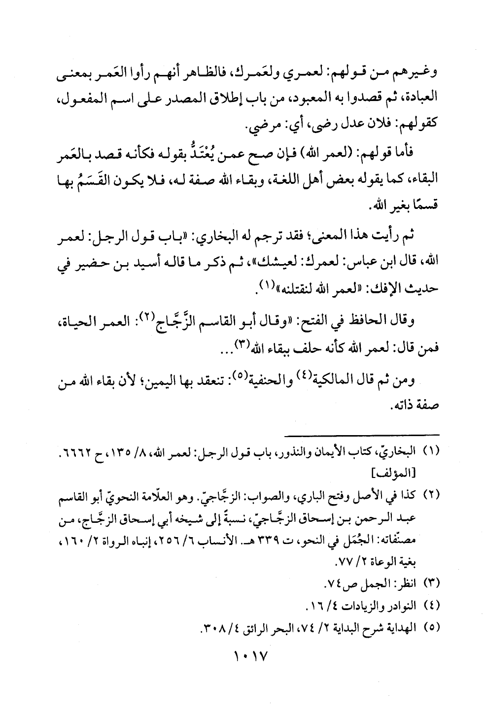 وقال الحافظ في الفتح: «وقال أبو القاسم الزَّجَّاج (¬٢): العمر الحياة، فمن قال: لعمر الله كأنه حلف ببقاء الله (¬٣) ...