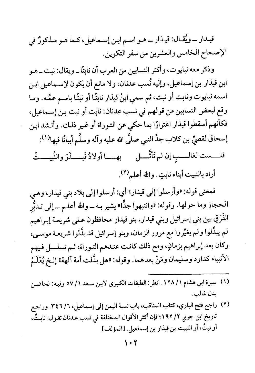 (¬٢) راجع فتح الباري، كتاب المناقب، باب نسبة اليمن إلى إسماعيل، ٦/ ٣٤٦. وراجع تاريخ ابن جريرٍ ٢/ ١٩٢؛ فإن أكثر الأقوال المختلفة في نسب عدنان تقول: نابتٌ، أو نبتٌ، أو النبيت بن قيذار بن إسماعيل. [المؤلف]