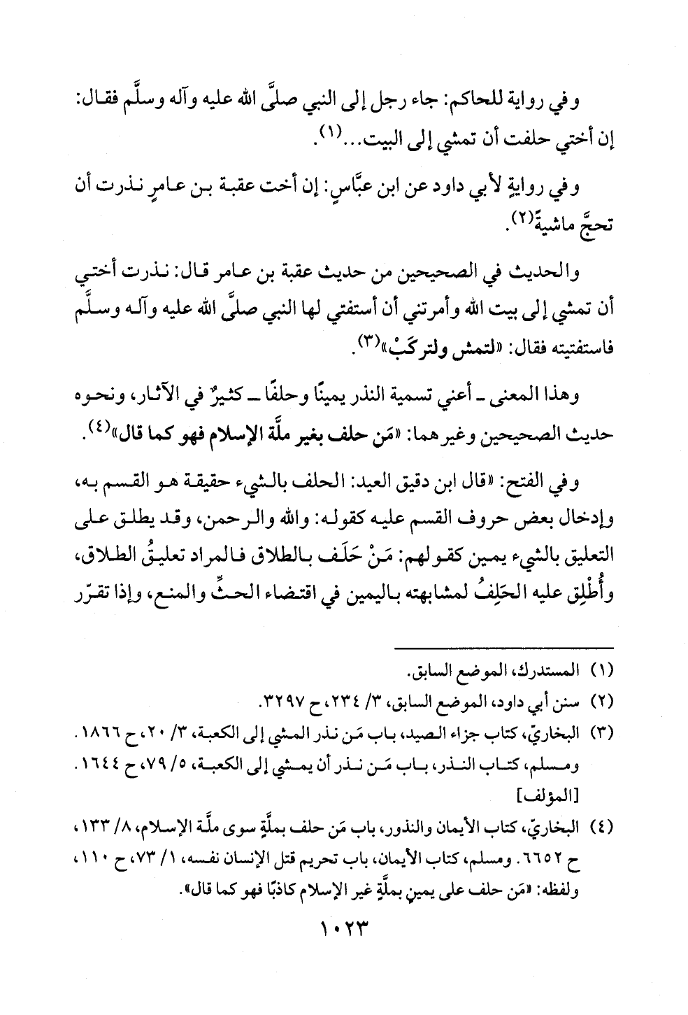 وهذا المعنى ــ أعني تسمية النذر يمينًا وحلفًا ــ كثيرٌ في الآثار، ونحوه حديث الصحيحين وغيرهما: «مَن حلف بغير ملَّة الإسلام فهو كما قال» (¬٤).