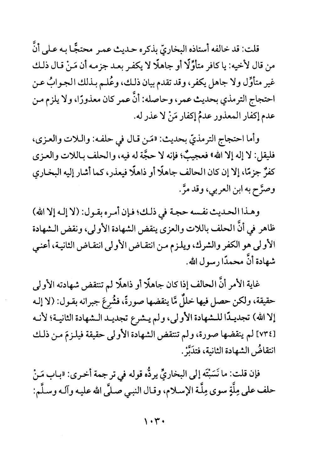 وأما احتجاج الترمذيّ بحديث: «مَن قال في حلفه: واللات والعزى، فليقل: لا إله إلا الله» فعجيبٌ؛ فإنه لا حجَّة له فيه، والحلف باللات والعزى كفرٌ جزمًا، إلا إن كان الحالف جاهلًا أو ذاهلًا فيعذر، كما أشار إليه البخاري وصرَّح به ابن العربي، وقد مرَّ.