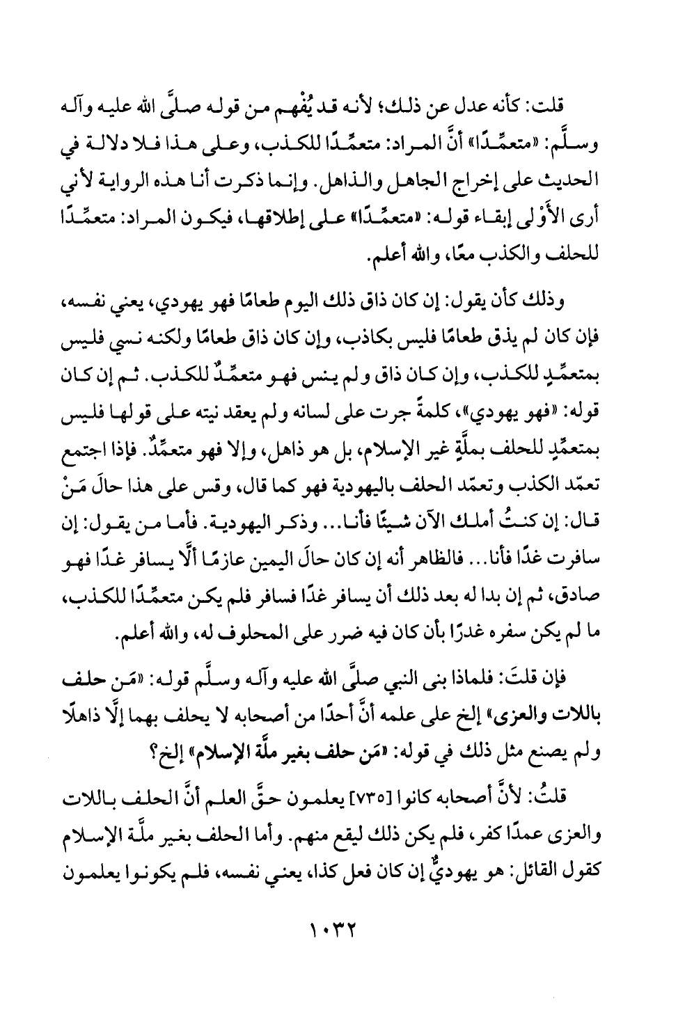 فإن قلتَ: فلماذا بنى النبي صلَّى الله عليه وآله وسلَّم قوله: «مَن حلف باللات والعزى» إلخ على علمه أنَّ أحدًا من أصحابه لا يحلف بهما إلَّا ذاهلًا ولم يصنع مثل ذلك في قوله: «مَن حلف بغير ملَّة الإسلام» إلخ؟