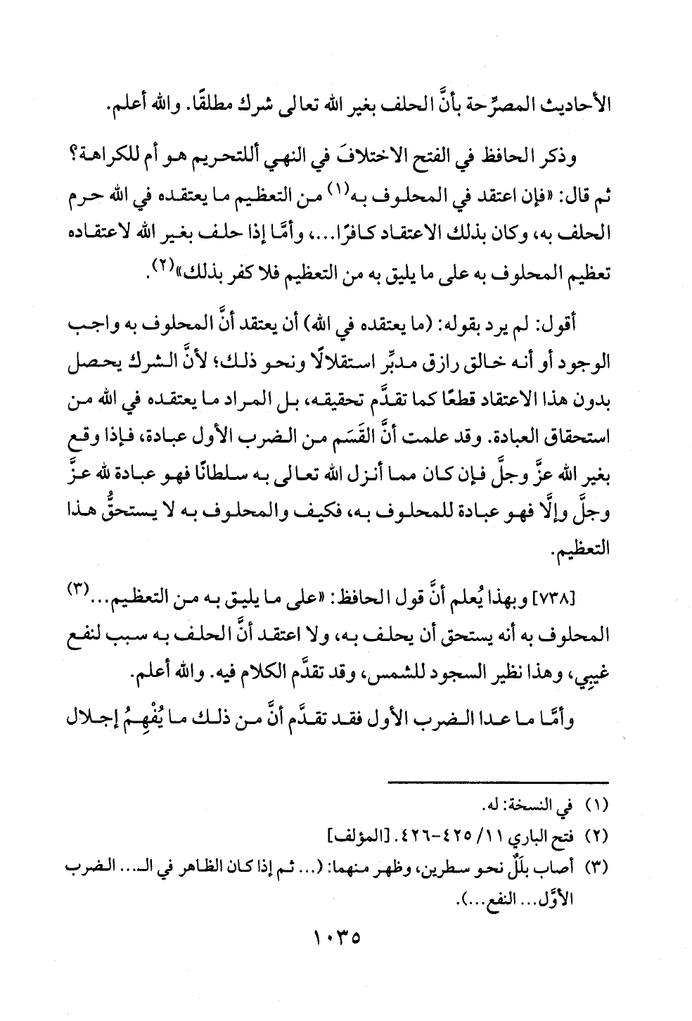 [٧٣٨] وبهذا يُعلم أنَّ قول الحافظ: «على ما يليق به من التعظيم ... (¬٣) المحلوف به أنه يستحق أن يحلف به، ولا اعتقد أنَّ الحلف به سبب لنفع غيبِي، وهذا نظير السجود للشمس، وقد تقدَّم الكلام فيه. والله أعلم.