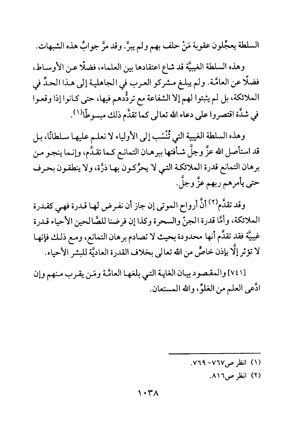 وهذه السلطة الغيبيَّة قد شاع اعتقادها بين العلماء, فضلًا عن الأوساط, فضلًا عن العامَّة. ولم يبلغ مشركو العرب في الجاهلية إلى هذا الحدِّ في الملائكة، بل لم يثبتوا لهم إلا الشفاعة مع تردُّدهم فيها، حتى كانوا إذا وقعوا في شدَّة اقتصروا على دعاء الله تعالى كما تقدَّم ذلك مبسوطًا (¬١).