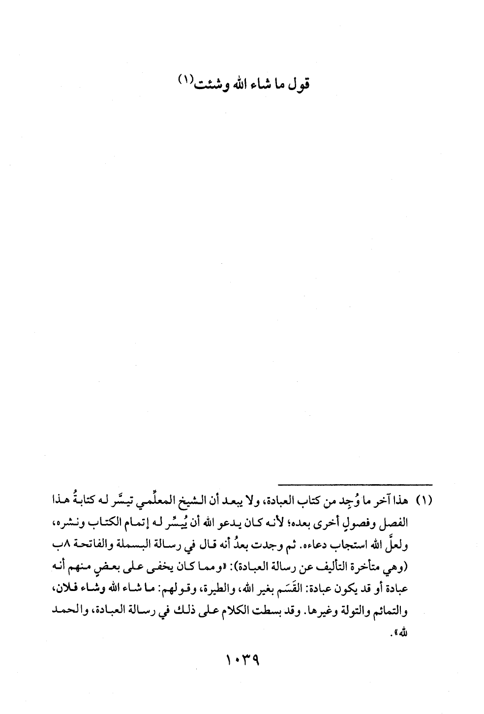 (¬١) هذا آخر ما وُجِد من كتاب العبادة، ولا يبعد أن الشيخ المعلِّمي تيسَّر له كتابةُ هذا الفصل وفصولٍ أخرى بعده؛ لأنه كان يدعو الله أن يُيسِّر له إتمام الكتاب ونشره، ولعلَّ الله استجاب دعاءه. ثم وجدت بعدُ أنه قال في رسالة البسملة والفاتحة ٨ ب (وهي متأخرة التأليف عن رسالة العبادة): «ومما كان يخفى على بعضٍ منهم أنه عبادة أو قد يكون عبادة: القَسَم بغير الله, والطيرة, وقولهم: ما شاء الله وشاء فلان, والتمائم والتولة وغيرها. وقد بسطت الكلام على ذلك في رسالة العبادة, والحمد لله».