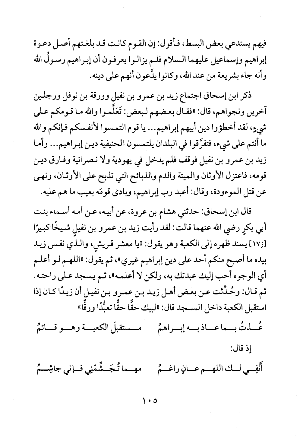 قال ابن إسحاق: حدثني هشام بن عروة، عن أبيه، عن أمه أسماء بنت أبي بكرٍ رضي الله عنهما قالت: لقد رأيت زيد بن عمرو بن نفيلٍ شيخًا كبيرًا [ز ١٧] يسند ظهره إلى الكعبة وهو يقول: "يا معشر قريشٍ، والذي نفس زيد بيده ما أصبح منكم أحد على دين إبراهيم غيري"، ثم يقول: "اللهم لو أعلم أي الوجوه أحب إليك عبدتك به، ولكن لا أعلمه"، ثم يسجد على راحته. ثم قال: وحُدِّثت عن بعض أهل زيد بن عمرو بن نفيل أن زيدًا كان إذا استقبل الكعبة داخل المسجد قال: "لبيك حقًّا حقًّا تعبُّدًا ورقًّا"