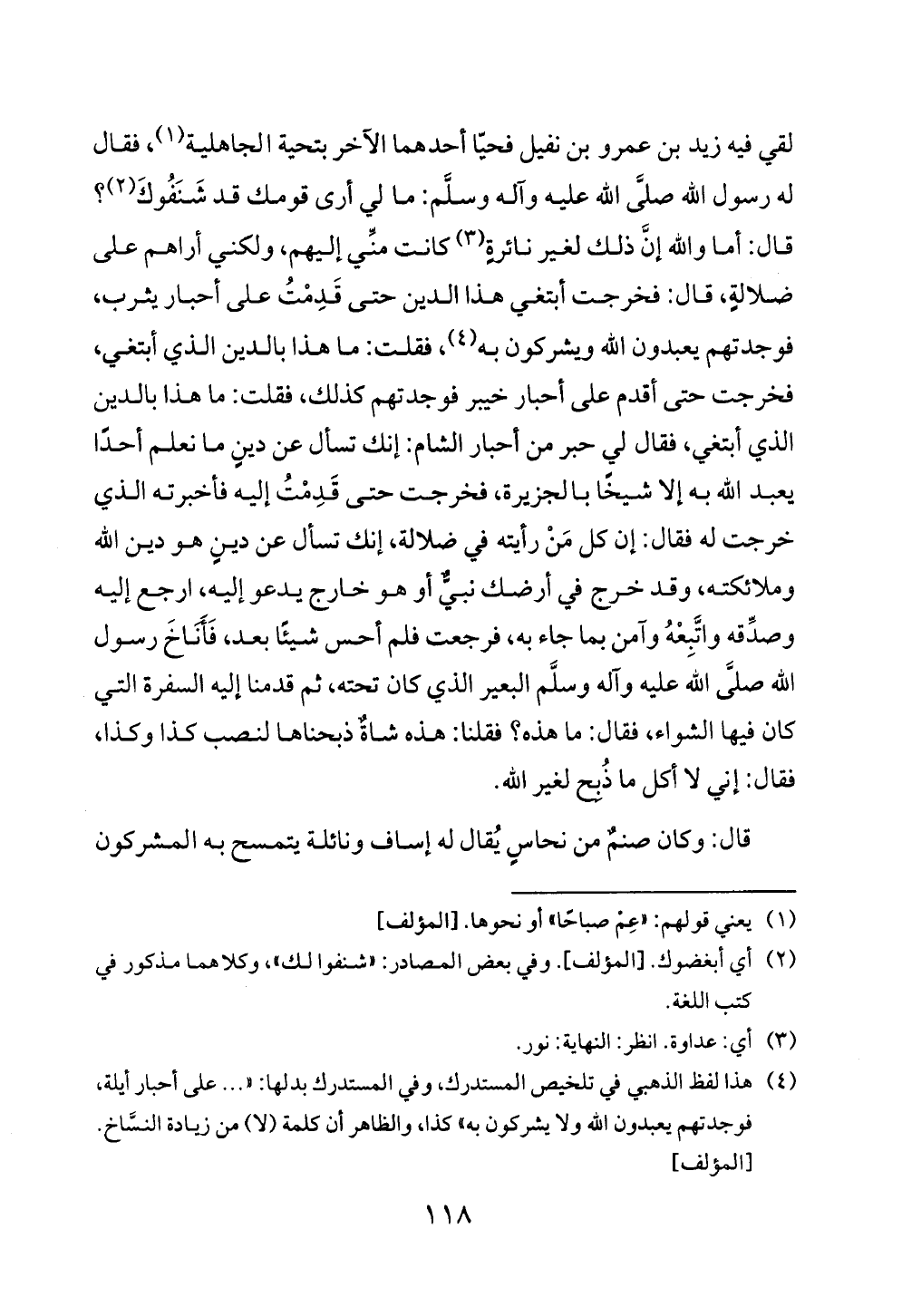 لقي فيه زيد بن عمرو بن نفيل فحيّا أحدهما الآخر بتحية الجاهلية (¬١)، فقال له رسول الله صلَّى الله عليه وآله وسلَّم: ما لي أرى قومك قد شَنَفُوكَ (¬٢)؟ قال: أما والله إنَّ ذلك لغير نائرةٍ (¬٣) كانت منِّي إليهم، ولكني أراهم على ضلالةٍ، قال: فخرجت أبتغي هذا الدين حتى قَدِمْتُ على أحبار يثرب، فوجدتهم يعبدون الله ويشركون به (¬٤)، فقلت: ما هذا بالدين الذي أبتغي، فخرجت حتى أقدم على أحبار خيبر فوجدتهم كذلك، فقلت: ما هذا بالدين الذي أبتغي، فقال لي حبر من أحبار الشام: إنك تسأل عن دينٍ ما نعلم أحدًا يعبد الله به إلا شيخًا بالجزيرة، فخرجت حتى قَدِمْتُ إليه فأخبرته الذي خرجت له فقال: إن كل مَنْ رأيته في ضلالة، إنك تسأل عن دينٍ هو دين الله وملائكته، وقد خرج في أرضك نبيٌّ أو هو خارج يدعو إليه، ارجع إليه وصدِّقه واتَّبِعْهُ وآمن بما جاء به، فرجعت فلم أحس شيئًا بعد، فَأَنَاخَ رسول الله صلَّى الله عليه وآله وسلَّم البعير الذي كان تحته، ثم قدمنا إليه السفرة التي كان فيها الشواء، فقال: ما هذه؟ فقلنا: هذه شاةٌ ذبحناها لنصب كذا وكذا، فقال: إني لا أكل ما ذُبِح لغير الله.