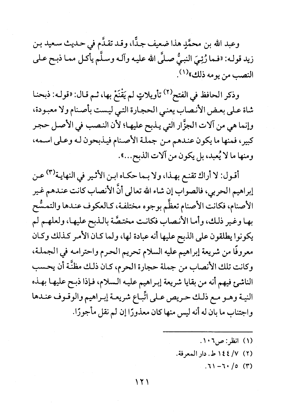 وذكر الحافظ في الفتح (¬٢) تأويلاتٍ لم يَقْنَعْ بها، ثم قال: "قوله: ذبحنا شاة على بعض الأنصاب يعني الحجارة التي ليست بأصنام ولا معبودة، وإنما هي من آلات الجزَّار التي يذبح عليها؛ لأن النصب في الأصل حجر كبير، فمنها ما يكون عندهم من جملة الأصنام فيذبحون له وعلى اسمه، ومنها ما لا يُعبد، بل يكون من آلات الذبح ... ".