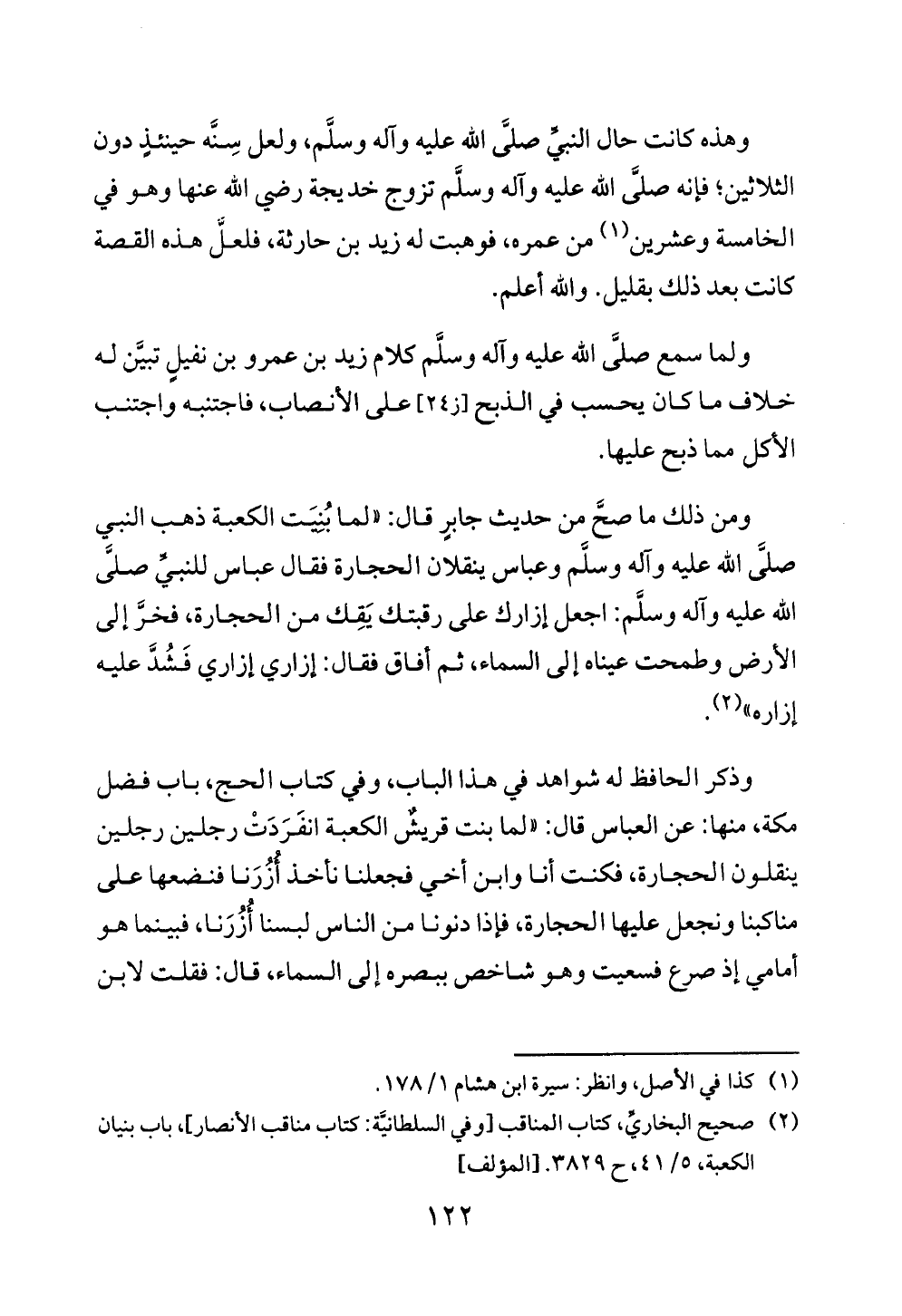 ولما سمع صلَّى الله عليه وآله وسلَّم كلام زيد بن عمرو بن نفيلٍ تبيَّن له خلاف ما كان يحسب في الذبح [ز ٢٤] على الأنصاب، فاجتنبه واجتنب الأكل مما ذبح عليها.