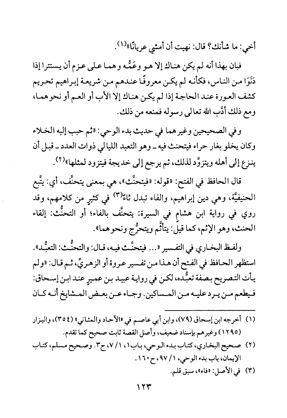 ولفظ البخاري في التفسير " ... فيتحنَّث فيه، قال: والتحنُّث: التعبُّد". استظهر الحافظ في الفتح أن هذا من تفسير عروة أو الزهريِّ، ثم قال: "ولم يأت التصريح بصفة تعبُّده, لكن في رواية عبيد بن عميرٍ عند ابن إسحاق: فيطعم من يرد عليه من المساكين. وجاء عن بعض المشايخ أنه كان