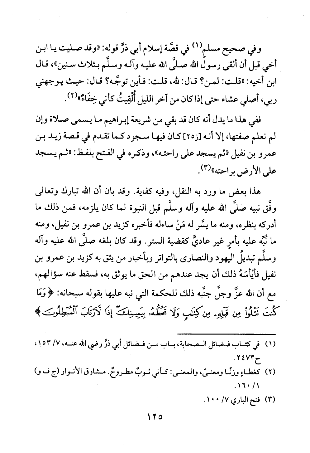 ففي هذا ما يدل أنه كان قد بقي من شريعة إبراهيم ما يسمى صلاة وإن لم نعلم صفتها، إلا أنه [ز ٢٥] كان فيها سجود كما تقدم في قصة زيد بن عمرو بن نفيل "ثم يسجد على راحته"، وذكره في الفتح بلفظ: "ثم يسجد على الأرض براحته" (¬٣).