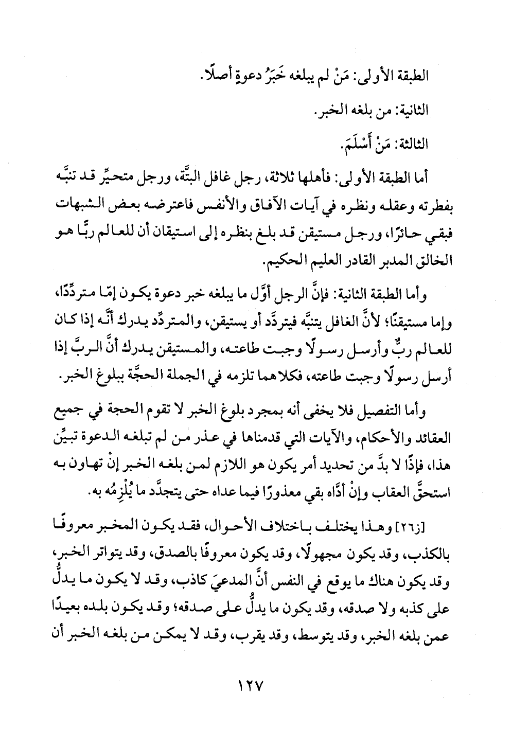 وأما الطبقة الثانية: فإنَّ الرجل أوَّل ما يبلغه خبر دعوة يكون إمّا متردِّدًا، وإما مستيقنًا؛ لأنَّ الغافل يتنبَّه فيتردَّد أو يستيقن، والمتردِّد يدرك أنَّه إذا كان للعالم ربٌّ وأرسل رسولًا وجبت طاعته، والمستيقن يدرك أنَّ الربَّ إذا أرسل رسولًا وجبت طاعته، فكلاهما تلزمه في الجملة الحجَّة ببلوغ الخبر.