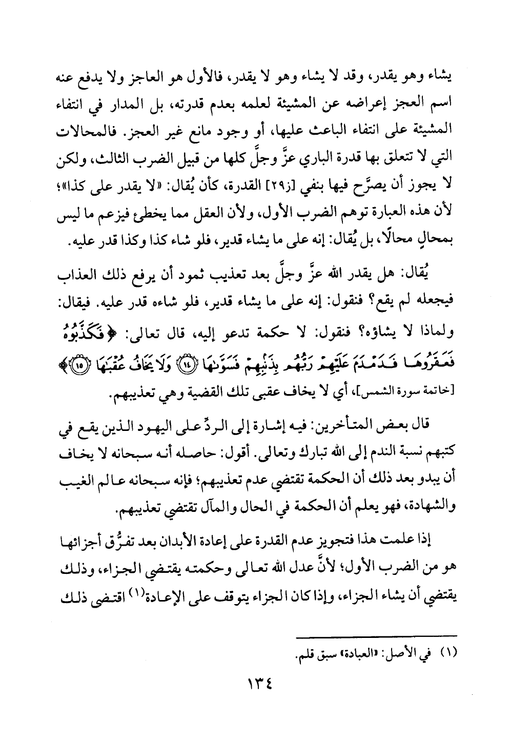 يُقال: هل يقدر الله عزَّ وجلَّ بعد تعذيب ثمود أن يرفع ذلك العذاب فيجعله لم يقع؟ فنقول: إنه على ما يشاء قدير، فلو شاءه قدر عليه. فيقال: ولماذا لا يشاؤه؟ فنقول: لا حكمة تدعو إليه، قال تعالى: {فَكَذَّبُوهُ فَعَقَرُوهَا فَدَمْدَمَ عَلَيْهِمْ رَبُّهُمْ بِذَنْبِهِمْ فَسَوَّاهَا (١٤) وَلَا يَخَافُ عُقْبَاهَا (١٥)} [خاتمة سورة الشمس]، أي لا يخاف عقبى تلك القضية وهي تعذيبهم.