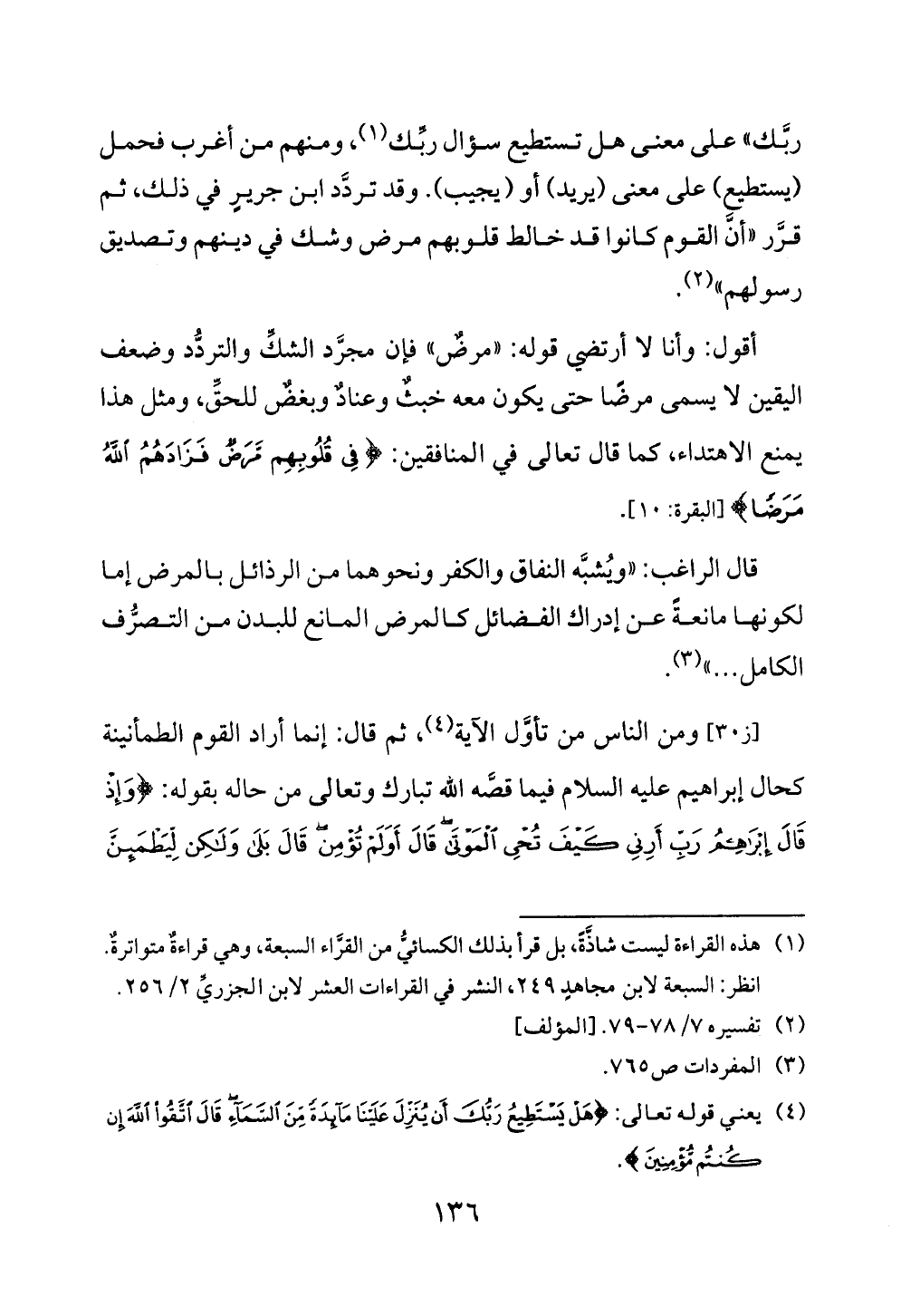 ربَّك" على معنى هل تستطيع سؤال ربِّك (¬١)، ومنهم من أغرب فحمل (يستطيع) على معنى (يريد) أو (يجيب). وقد تردَّد ابن جريرٍ في ذلك، ثم قرَّر "أنَّ القوم كانوا قد خالط قلوبهم مرض وشك في دينهم وتصديق رسولهم" (¬٢).