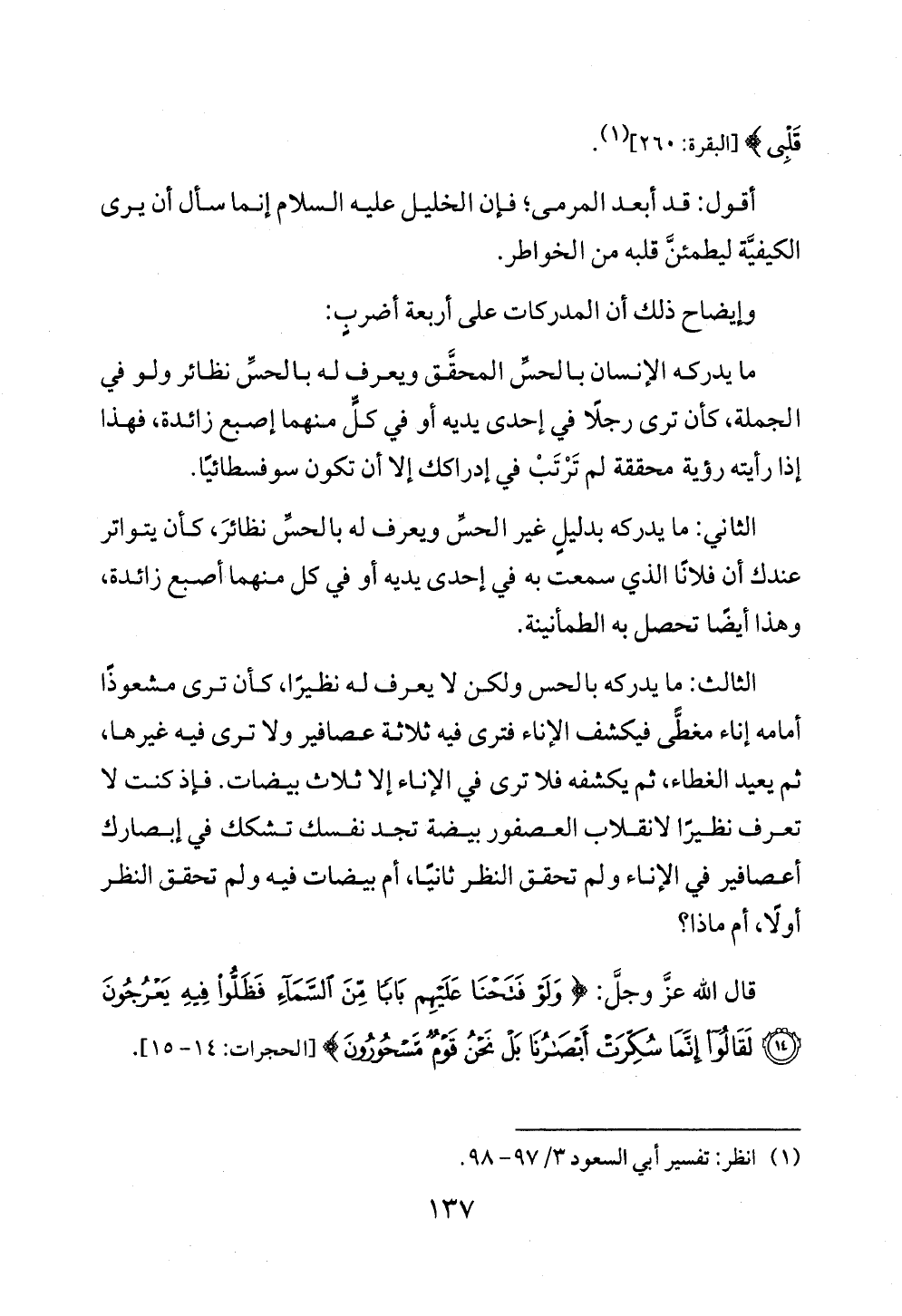 أقول: قد أبعد المرمى؛ فإن الخليل عليه السلام إنما سأل أن يرى الكيفيَّة ليطمئنَّ قلبه من الخواطر.