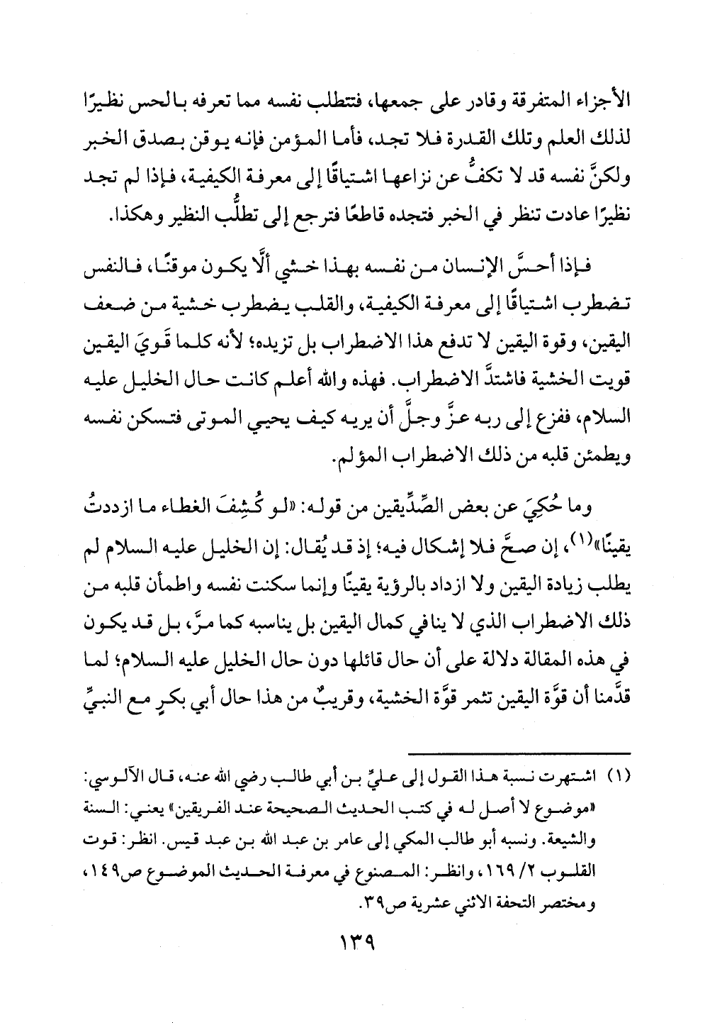 فإذا أحسَّ الإنسان من نفسه بهذا خشي ألَّا يكون موقنًا، فالنفس تضطرب اشتياقًا إلى معرفة الكيفية، والقلب يضطرب خشية من ضعف اليقين، وقوة اليقين لا تدفع هذا الاضطراب بل تزيده؛ لأنه كلما قَويَ اليقين قويت الخشية فاشتدَّ الاضطراب. فهذه والله أعلم كانت حال الخليل عليه السلام، ففزع إلى ربه عزَّ وجلَّ أن يريه كيف يحيي الموتى فتسكن نفسه ويطمئن قلبه من ذلك الاضطراب المؤلم.
