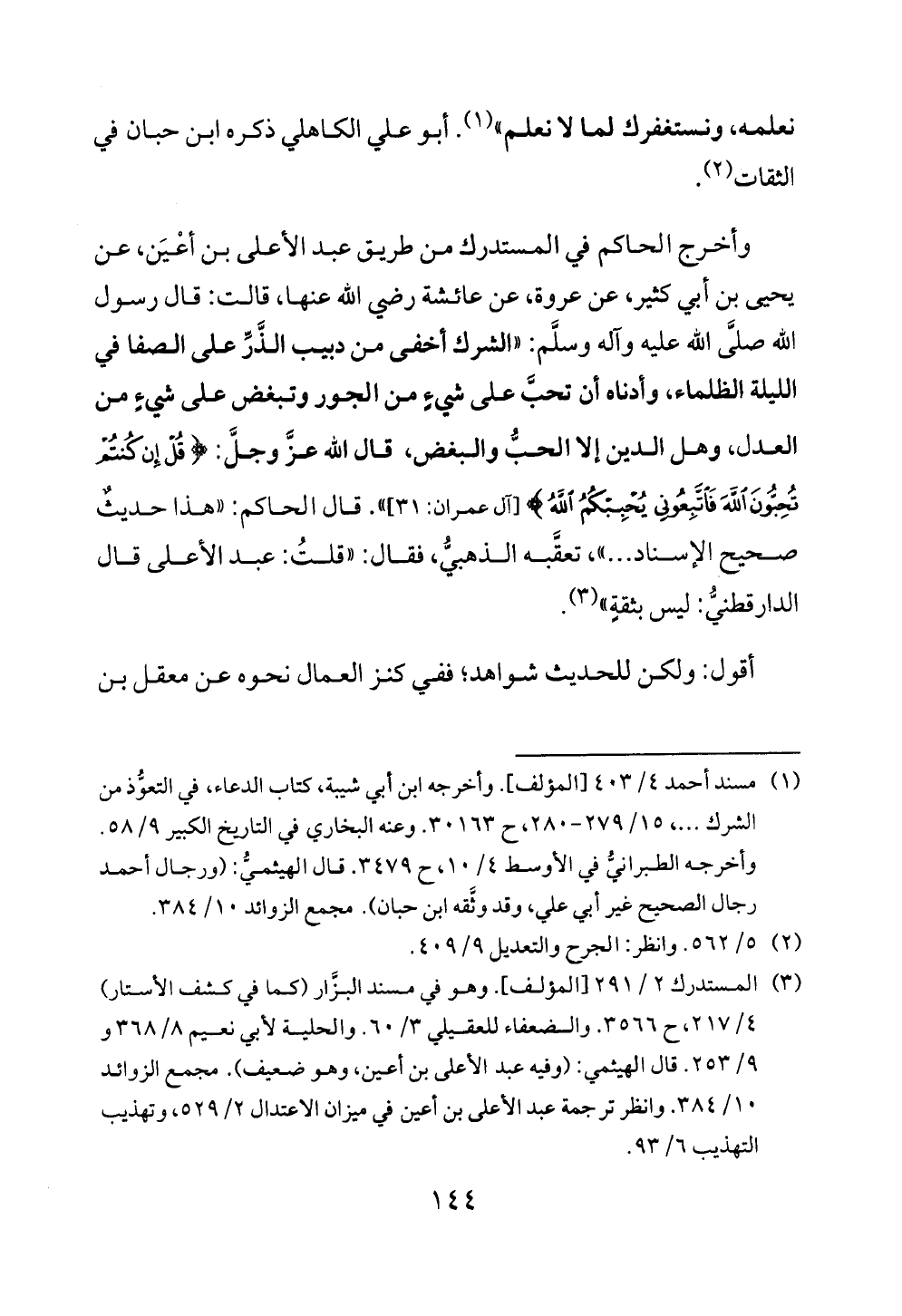 وأخرج الحاكم في المستدرك من طريق عبد الأعلى بن أعْيَن، عن يحيى بن أبي كثير، عن عروة، عن عائشة رضي الله عنها، قالت: قال رسول الله صلَّى الله عليه وآله وسلَّم: "الشرك أخفى من دبيب الذَّرِّ على الصفا في الليلة الظلماء، وأدناه أن تحبَّ على شيءٍ من الجور وتبغض على شيءٍ من العدل، وهل الدين إلا الحبُّ والبغض، قال الله عزَّ وجلَّ: {قُلْ إِنْ كُنْتُمْ تُحِبُّونَ اللَّهَ فَاتَّبِعُونِي يُحْبِبْكُمُ اللَّهُ} [آل عمران: ٣١] ". قال الحاكم: "هذا حديثٌ صحيح الإسناد ... "، تعقَّبه الذهبيُّ، فقال: "قلتُ: عبد الأعلى قال الدارقطنيُّ: ليس بثقةٍ" (¬٣).
