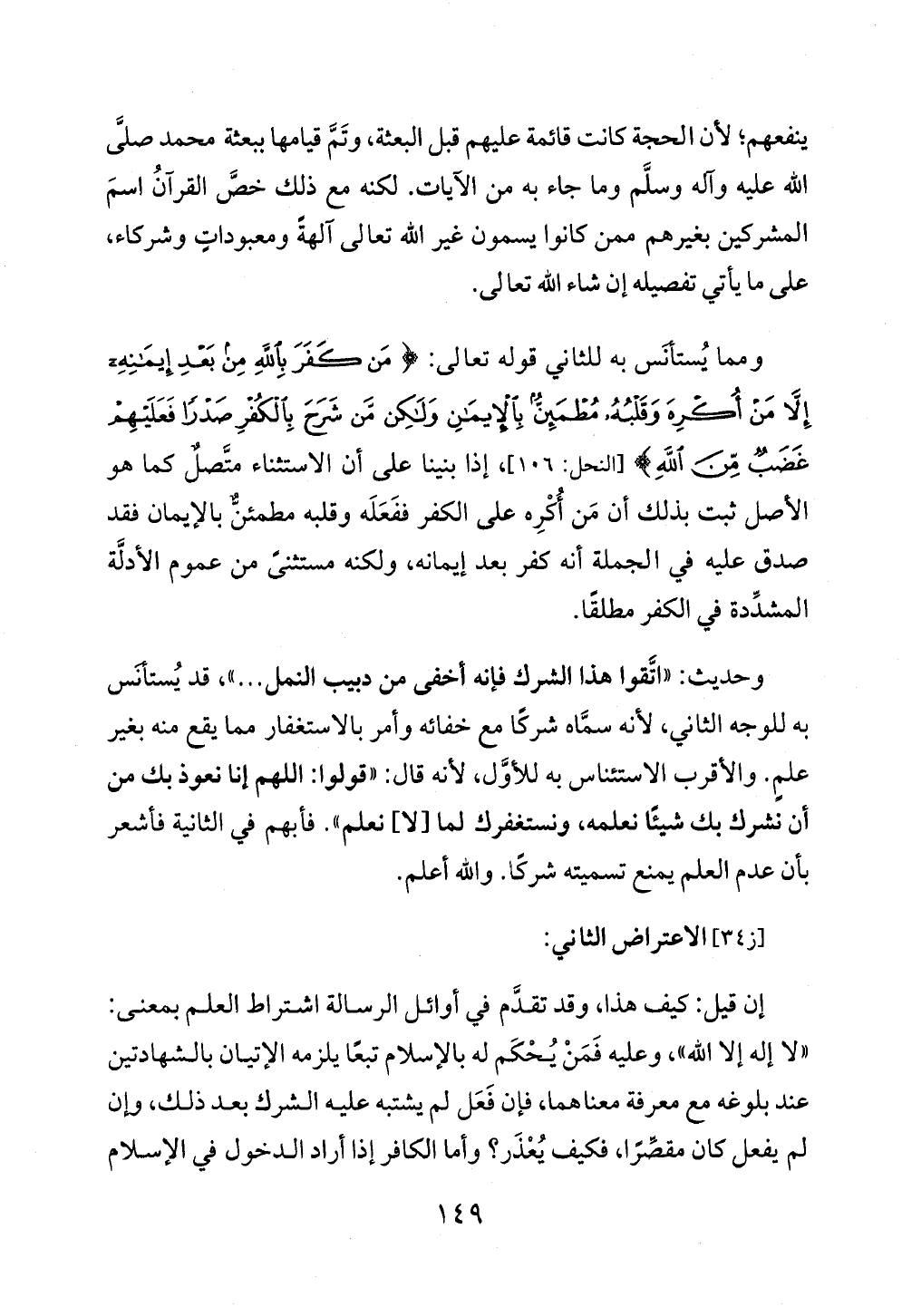 وحديث: "اتَّقوا هذا الشرك فإنه أخفى من دبيب النمل ... "، قد يُستأنَس به للوجه الثاني، لأنه سمَّاه شركًا مع خفائه وأمر بالاستغفار مما يقع منه بغير علمٍ. والأقرب الاستئناس به للأوَّل، لأنه قال: "قولوا: اللهم إنا نعوذ بك من أن نشرك بك شيئًا نعلمه، ونستغفرك لما [لا] نعلم". فأبهم في الثانية فأشعر بأن عدم العلم يمنع تسميته شركًا. والله أعلم.