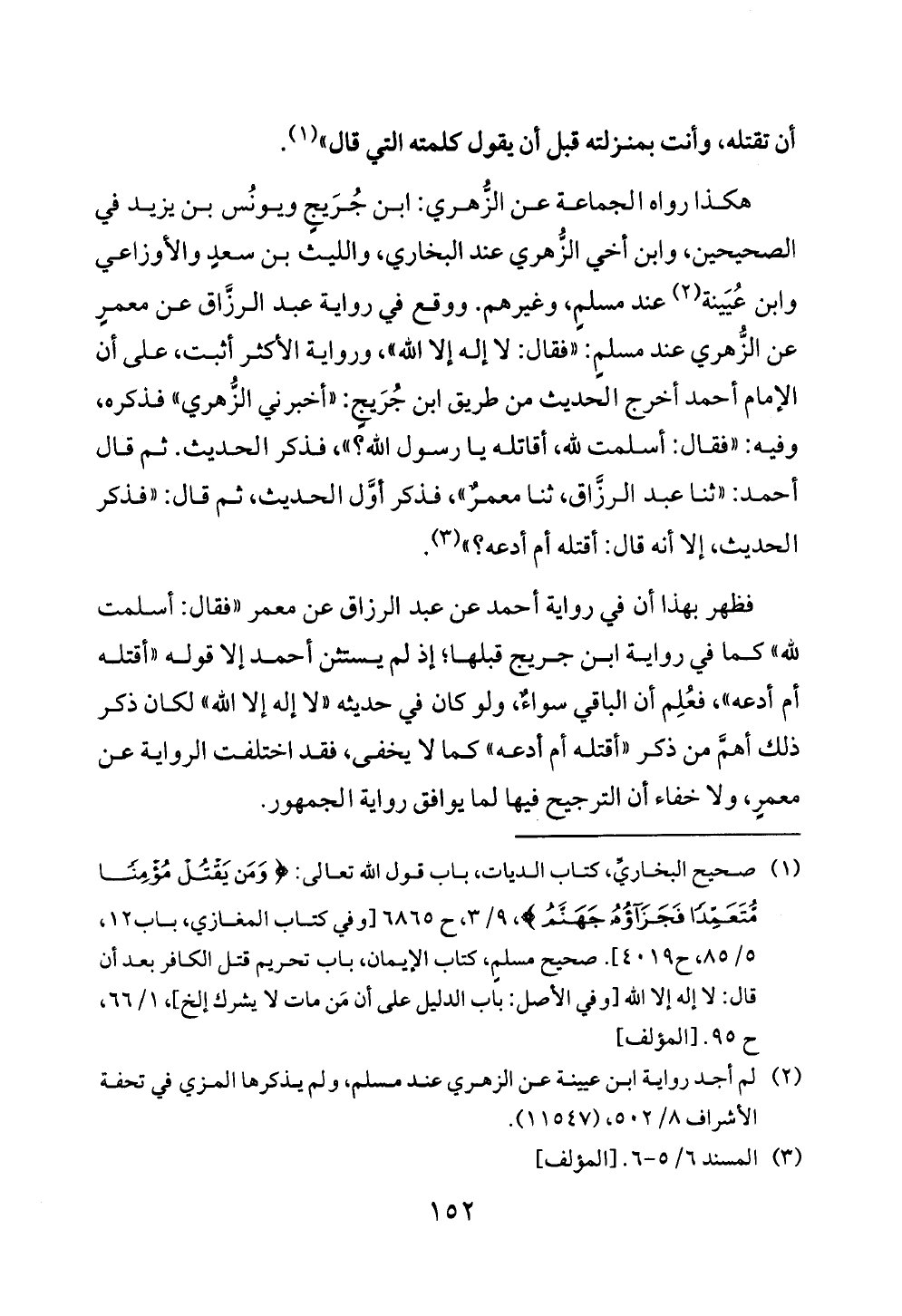 (¬١) صحيح البخاريِّ، كتاب الديات، باب قول الله تعالى: {وَمَنْ يَقْتُلْ مُؤْمِنًا مُتَعَمِّدًا فَجَزَاؤُهُ جَهَنَّمُ}، ٩/ ٣، ح ٦٨٦٥ [وفي كتاب المغازي، باب ١٢، ٥/ ٨٥، ح ٤٠١٩]. صحيح مسلمٍ، كتاب الإيمان، باب تحريم قتل الكافر بعد أن قال: لا إله إلا الله [وفي الأصل: باب الدليل على أن مَن مات لا يشرك إلخ]، ١/ ٦٦، ح ٩٥. [المؤلف]