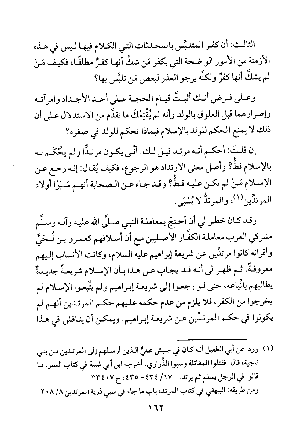 وقد كان خطر لي أن أحتجّ بمعاملة النبي صلَّى الله عليه وآله وسلَّم مشركي العرب معاملة الكفَّار الأصليين مع أن أسلافهم كعمرو بن لُحَيٍّ وأقرانه كانوا مرتدِّين عن شريعة إبراهيم عليه السلام، وكانت الأنساب إليهم معروفةً. ثم ظهر لي أنه قد يجاب عن هذا بأن الإسلام شريعةٌ جديدةٌ يطالبهم باتِّباعه، حتى لو رجعوا إلى شريعة إبراهيم ولم يتَّبعوا الإسلام لم يخرجوا من الكفر، فلا يلزم من عدم حكمه عليهم حكم المرتدين أنهم لم يكونوا في حكم المرتدِّين عن شريعة إبراهيم. ويمكن أن يناقش في هذا