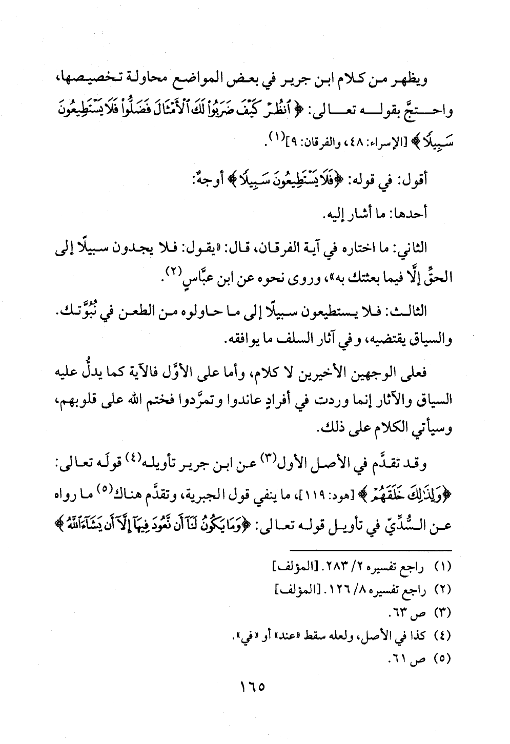 ويظهر من كلام ابن جرير في بعض المواضع محاولة تخصيصها، واحتجَّ بقوله تعالى: {انْظُرْ كَيْفَ ضَرَبُوا لَكَ الْأَمْثَالَ فَضَلُّوا فَلَا يَسْتَطِيعُونَ سَبِيلًا} [الإسراء: ٤٨، والفرقان: ٩] (¬١).