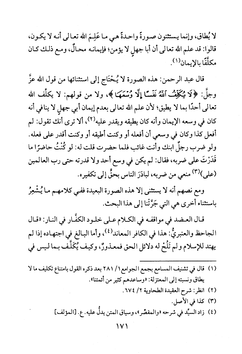 قال عبد الرحمن: هذه الصورة لا يُحْتَاج إلى استثنائها من قول الله عزَّ وجلَّ: {لَا يُكَلِّفُ اللَّهُ نَفْسًا إِلَّا وُسْعَهَا}، ولا من قولهم: لا يكلِّف الله تعالى أحدًا بما لا يطيق؛ لأن علم الله تعالى بعدم إيمان أبي جهلٍ لا ينافي أنه كان في وسعه الإيمان وأنه كان يطيقه ويقدر عليه (¬٢)، ألا ترى أنك تقول: لم أفعل كذا وكان في وسعي أن أفعله أو وكنت أطيقه أو وكنت أقدر على فعله. ولو ضرب رجلٌ ابنك وأنت غائب فلما حضرت قلت له: لو كُنْتُ حاضرًا ما قَدَرْتَ على ضربه، فقال: لم يكن في وسع أحد ولا قدرته حتى رب العالمين (على) (¬٣) منعي من ضربه، لبادَرَ الناس بحقٍّ إلى تكفيره.