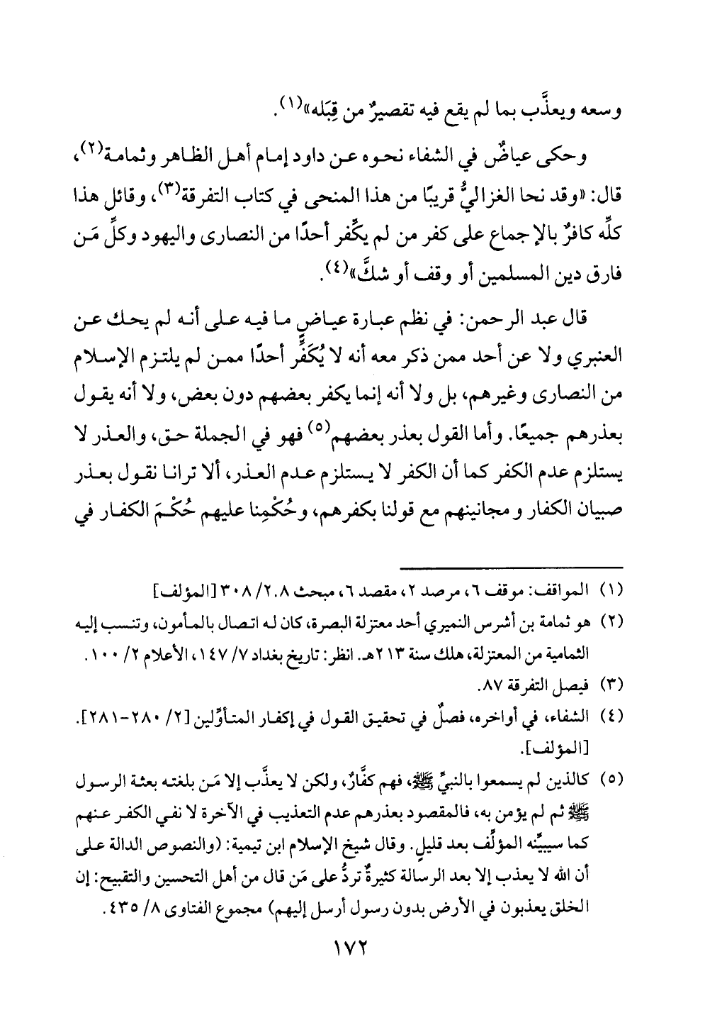 وحكى عياضٌ في الشفاء نحوه عن داود إمام أهل الظاهر وثمامة (¬٢)، قال: "وقد نحا الغزاليُّ قريبًا من هذا المنحى في كتاب التفرقة (¬٣)، وقائل هذا كلِّه كافرٌ بالإجماع على كفر من لم يكِّفر أحدًا من النصارى واليهود وكلِّ مَن فارق دين المسلمين أو وقف أو شكَّ" (¬٤).