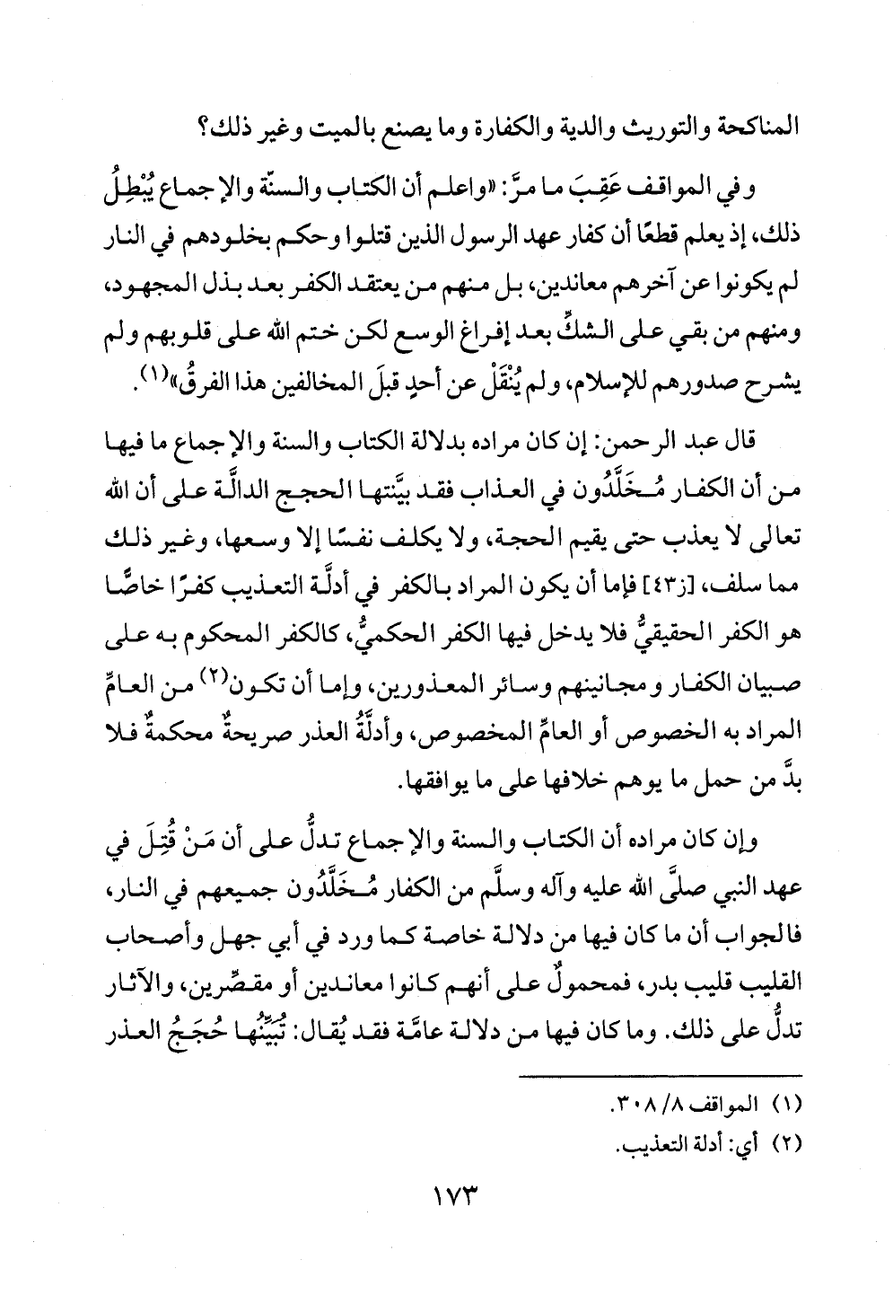 قال عبد الرحمن: إن كان مراده بدلالة الكتاب والسنة والإجماع ما فيها من أن الكفار مُخَلَّدُون في العذاب فقد بيَّنتها الحجج الدالَّة على أن الله تعالى لا يعذب حتى يقيم الحجة، ولا يكلف نفسًا إلا وسعها، وغير ذلك مما سلف، [ز ٤٣] فإما أن يكون المراد بالكفر في أدلَّة التعذيب كفرًا خاصًّا هو الكفر الحقيقيُّ فلا يدخل فيها الكفر الحكميُّ، كالكفر المحكوم به على صبيان الكفار ومجانينهم وسائر المعذورين، وإما أن تكون (¬٢) من العامِّ المراد به الخصوص أو العامِّ المخصوص، وأدلَّةُ العذر صريحةٌ محكمةٌ فلا بدَّ من حمل ما يوهم خلافها على ما يوافقها.