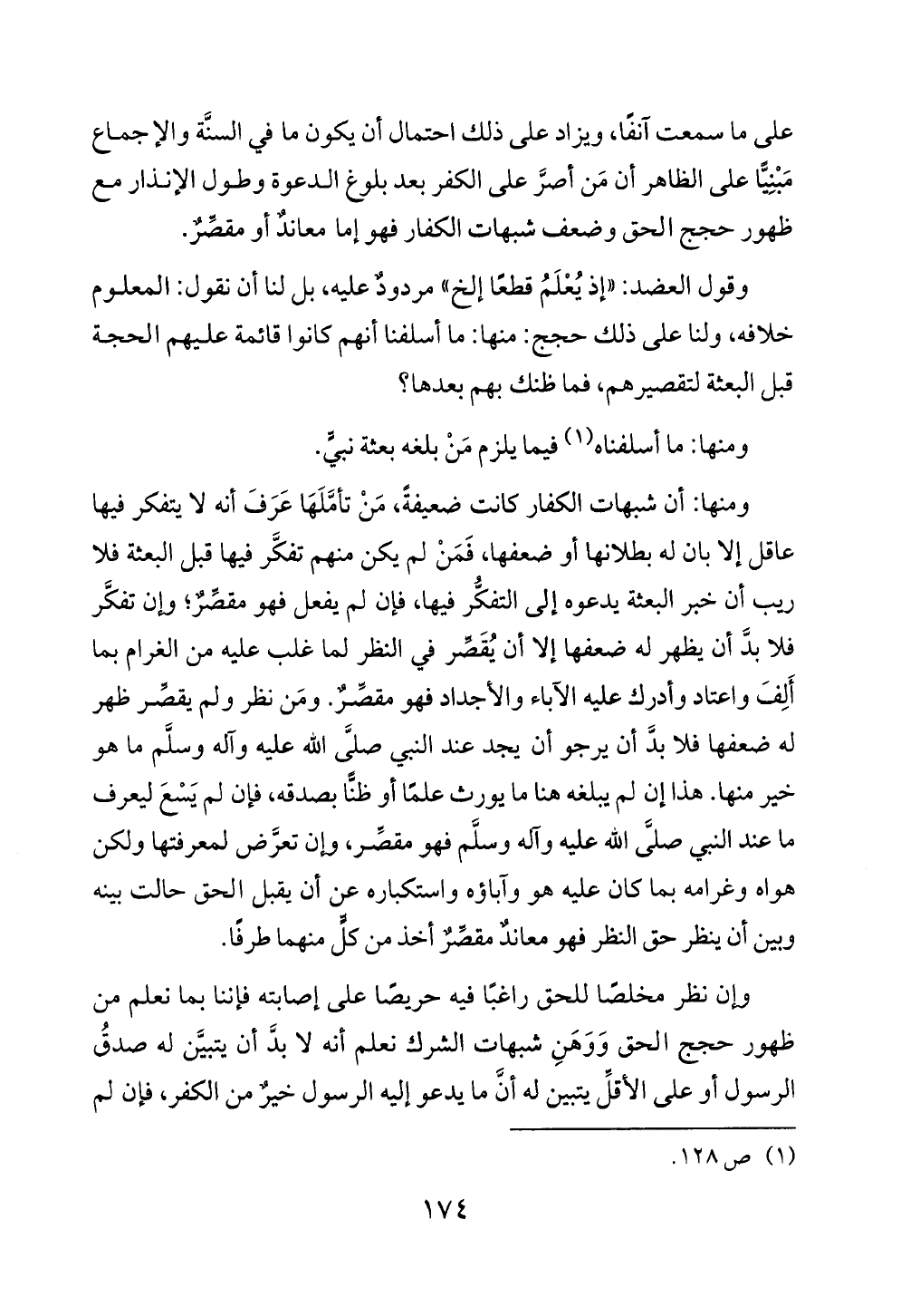 ومنها: أن شبهات الكفار كانت ضعيفةً، مَنْ تأمَّلَهَا عَرَفَ أنه لا يتفكر فيها عاقل إلا بان له بطلانها أو ضعفها، فَمَنْ لم يكن منهم تفكَّر فيها قبل البعثة فلا ريب أن خبر البعثة يدعوه إلى التفكُّر فيها، فإن لم يفعل فهو مقصِّرٌ؛ وإن تفكَّر فلا بدَّ أن يظهر له ضعفها إلا أن يُقَصِّر في النظر لما غلب عليه من الغرام بما أَلِفَ واعتاد وأدرك عليه الآباء والأجداد فهو مقصِّرٌ. ومَن نظر ولم يقصِّر ظهر له ضعفها فلا بدَّ أن يرجو أن يجد عند النبي صلَّى الله عليه وآله وسلَّم ما هو خير منها. هذا إن لم يبلغه هنا ما يورث علمًا أو ظنًّا بصدقه، فإن لم يَسْعَ ليعرف ما عند النبي صلَّى الله عليه وآله وسلَّم فهو مقصِّر، وإن تعرَّض لمعرفتها ولكن هواه وغرامه بما كان عليه هو وآباؤه واستكباره عن أن يقبل الحق حالت بينه وبين أن ينظر حق النظر فهو معاندٌ مقصِّرٌ أخذ من كلٍّ منهما طرفًا.