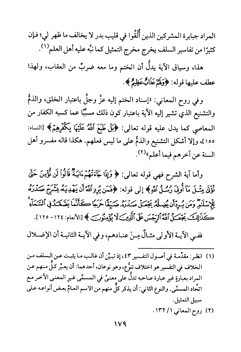 وفي روح المعاني: "إسناد الختم إليه عزَّ وجلَّ باعتبار الخلق، والذمُّ والتشنيع الذي تشير إليه الآية باعتبار كون ذلك مسبَّبًا عما كسبه الكفار من المعاصي كما يدل عليه قوله تعالى: {بَلْ طَبَعَ اللَّهُ عَلَيْهَا بِكُفْرِهِمْ} [النساء: ١٥٥]، وإلا أشكل التشنيع والذمُّ على ما ليس فعلهم. هكذا قاله مفسرو أهل السنة عن آخرهم فيما أعلم" (¬٢).