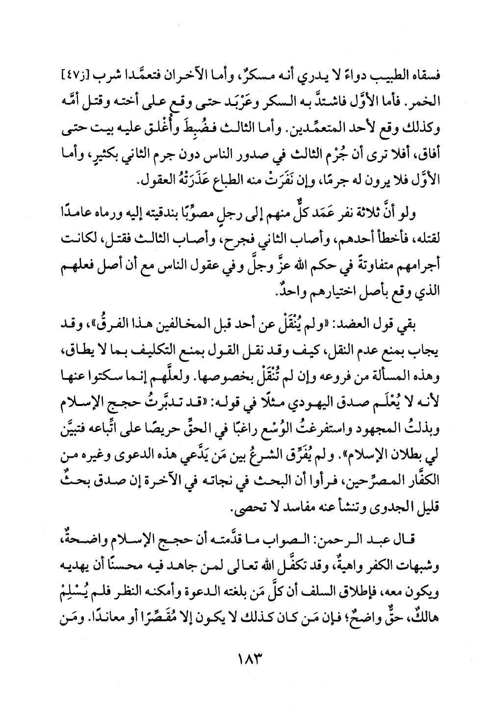 فسقاه الطبيب دواءً لا يدري أنه مسكرٌ، وأما الآخران فتعمَّدا شرب [ز ٤٧] الخمر. فأما الأوَّل فاشتدَّ به السكر وعَرْبَد حتى وقع على أخته وقتل أمَّه وكذلك وقع لأحد المتعمِّدين. وأما الثالث فضُبِطَ وأُغْلق عليه بيت حتى أفاق، أفلا ترى أن جُرْم الثالث في صدور الناس دون جرم الثاني بكثيرٍ، وأما الأوَّل فلا يرون له جرمًا، وإن نَفَرَتْ منه الطباع عَذَرَتْهُ العقول.